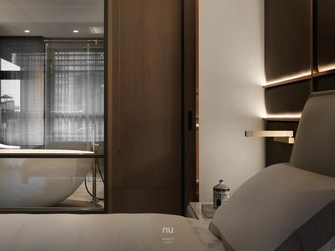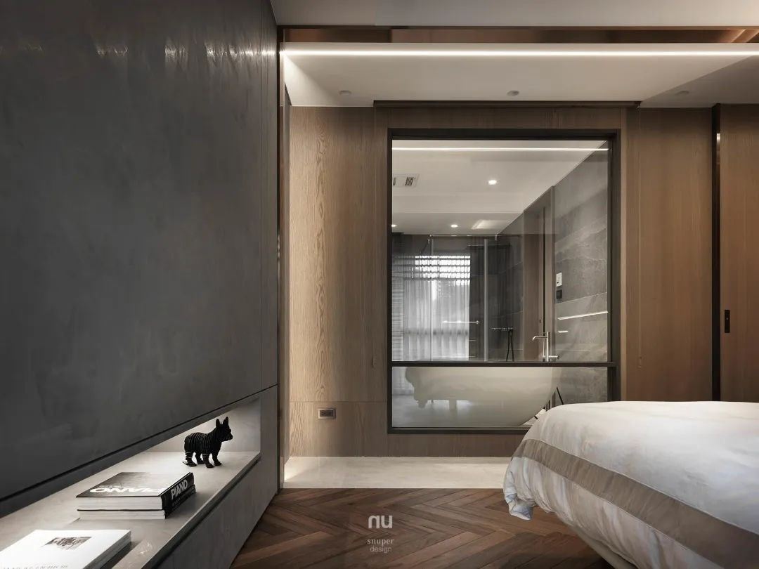 主卧床头墙以绷皮结合镀钛光带,地坪采人字拼,与行走动线有所区隔,再再显现低奢质感。