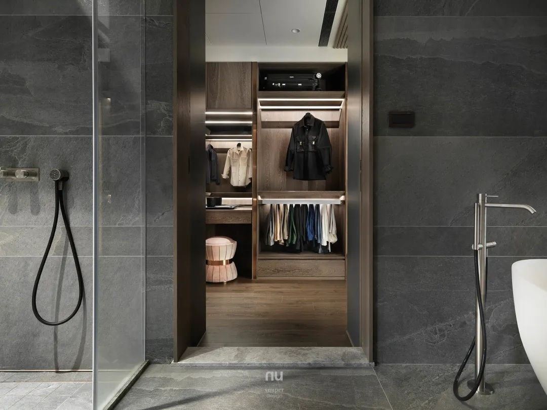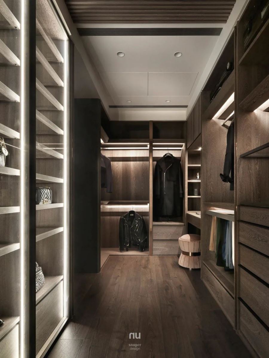 更衣室与主浴相邻,兼具梳妆台和完善的收纳规划。依据屋主需求将需收纳的物品分门别类规划,规划有透明推拉门,更便于收纳精品包款,也在间接光源的规划上更有用心。