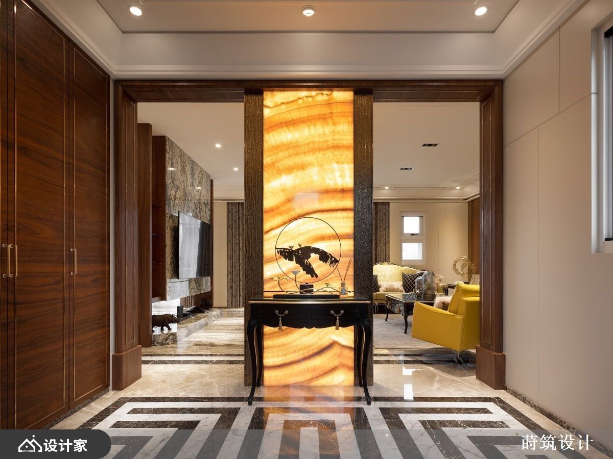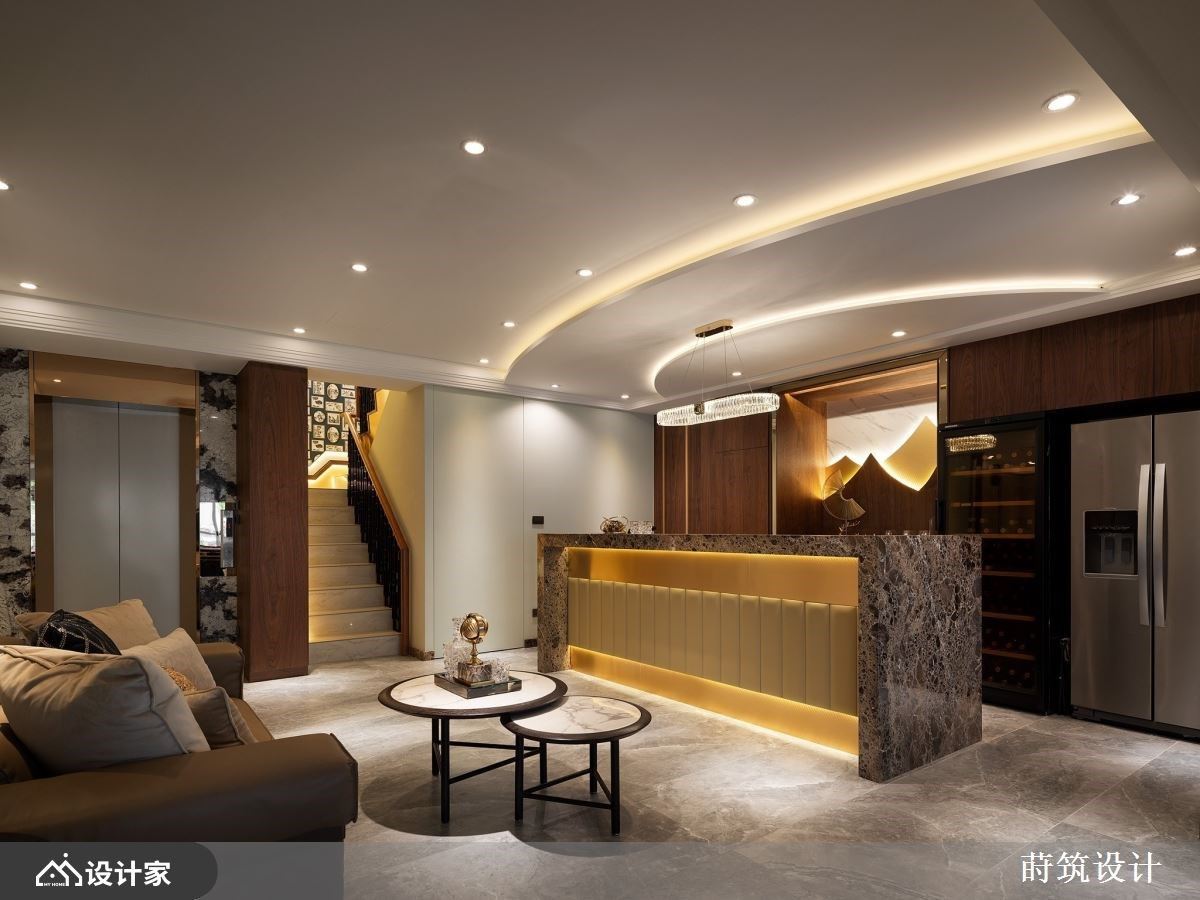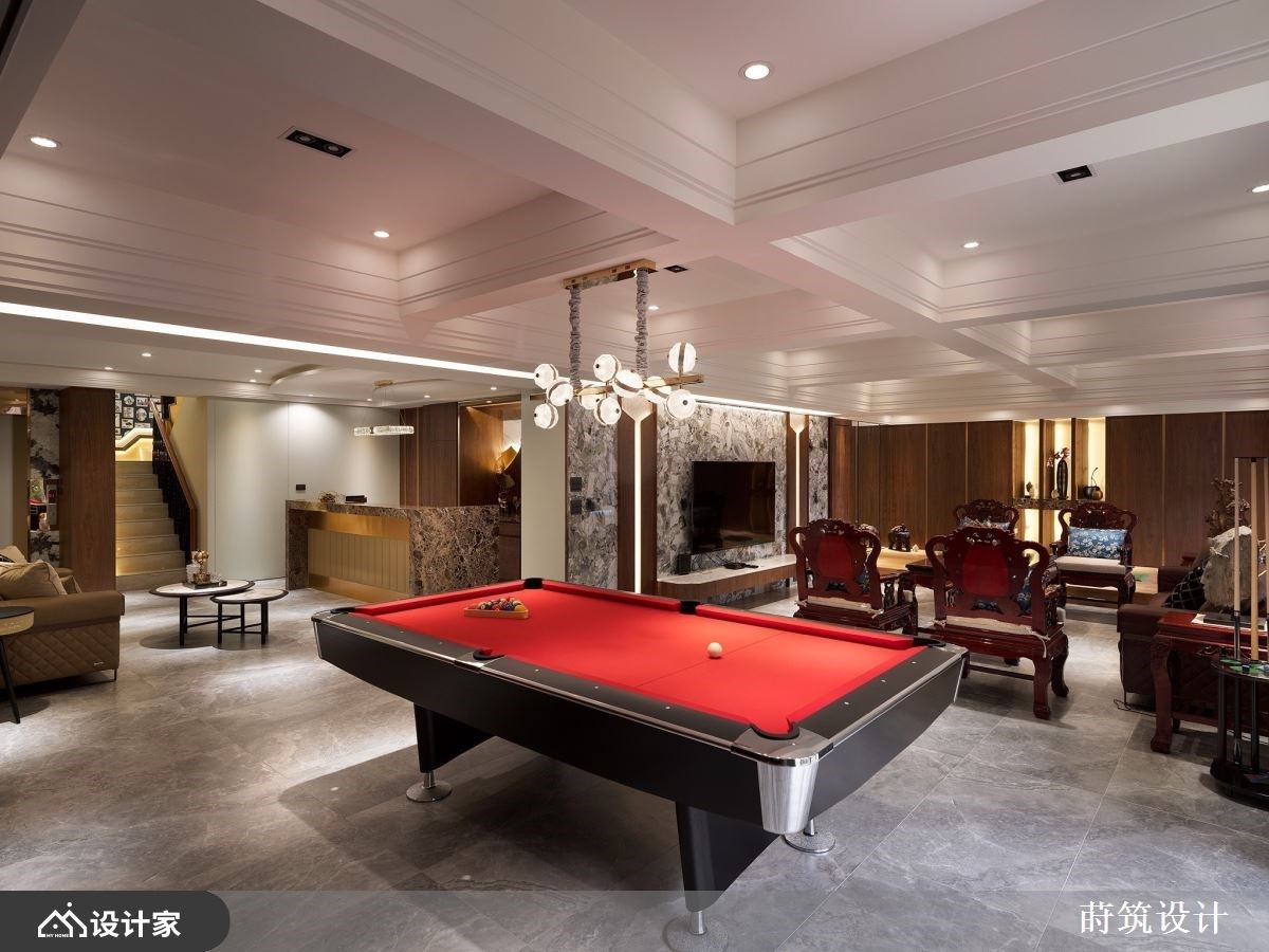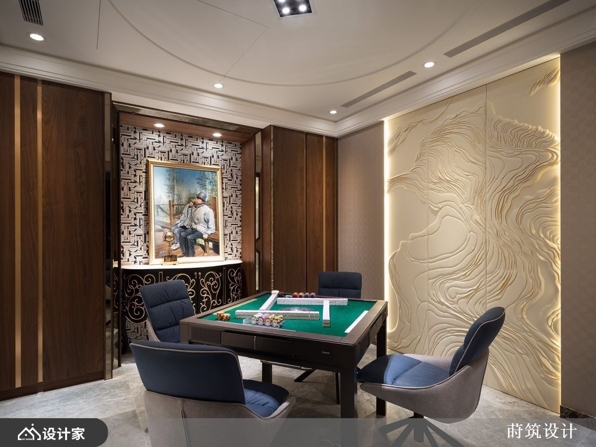 入室玄关以木质搭配石材交织磅礡的气势,通往客厅的门以木质勾勒,并于中段规划金黄色石材制成的屏风,除了为可作为端景墙让来者一览屋主不凡的品味外,还可阻隔视觉,确保屋内隐私。客、餐、厨空间以质感的石材地坪围塑大器的视觉,电视墙利用相似的选材与沙发背墙相互呼应,通透的柜体设计串联餐厨空间,增添互动性。因应居者兴趣,于家中规划吧台、撞球间、麻将室与视听室等娱乐性多功能空间,为居家生活增添不一样的风采。