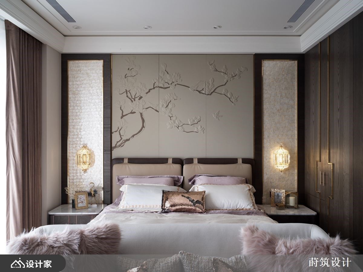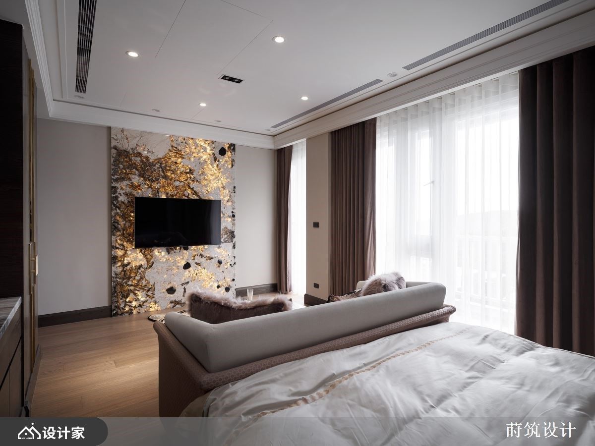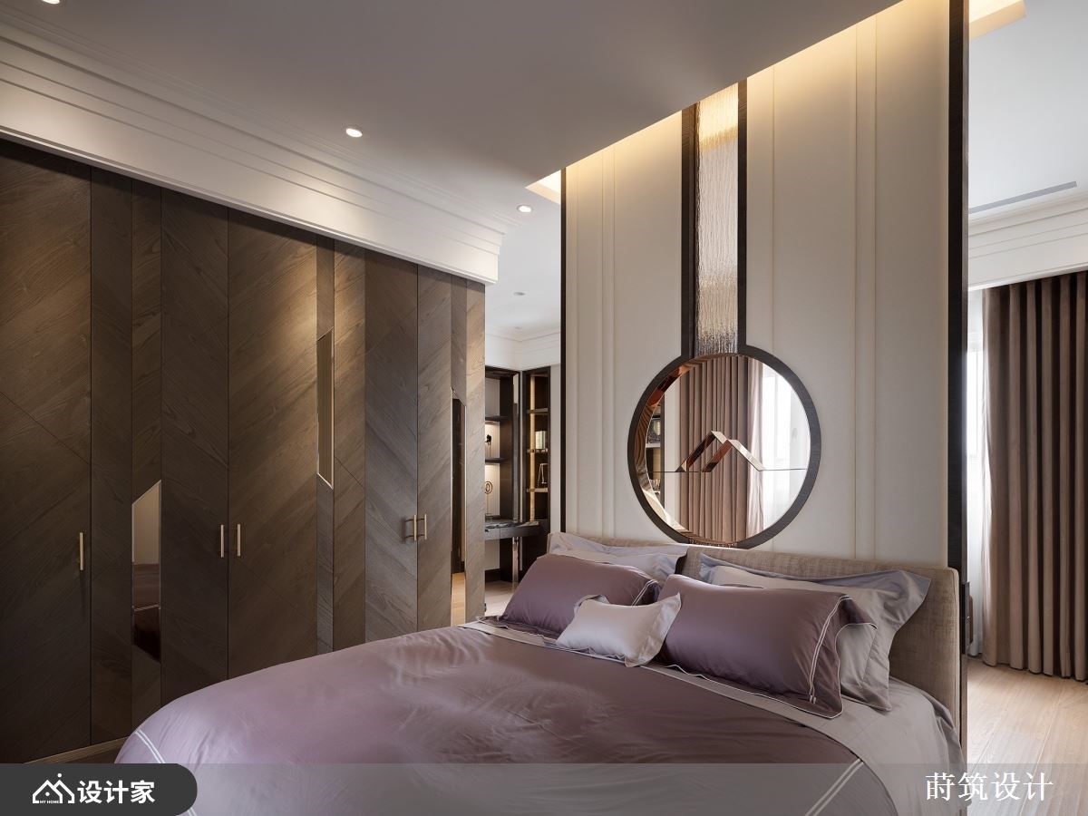 首间卧室将书桌、卫浴沿墙面规划,并以床为中心规划回字型动线,床头背板添抹中式花窗语汇,将自然光线引入,明亮典雅。第二间卧室以温润木质佐以低彩度色彩,为居者提供舒适的休憩氛围,并以电视墙为端景墙,在婉约的设计中隐隐透露着奢华感。