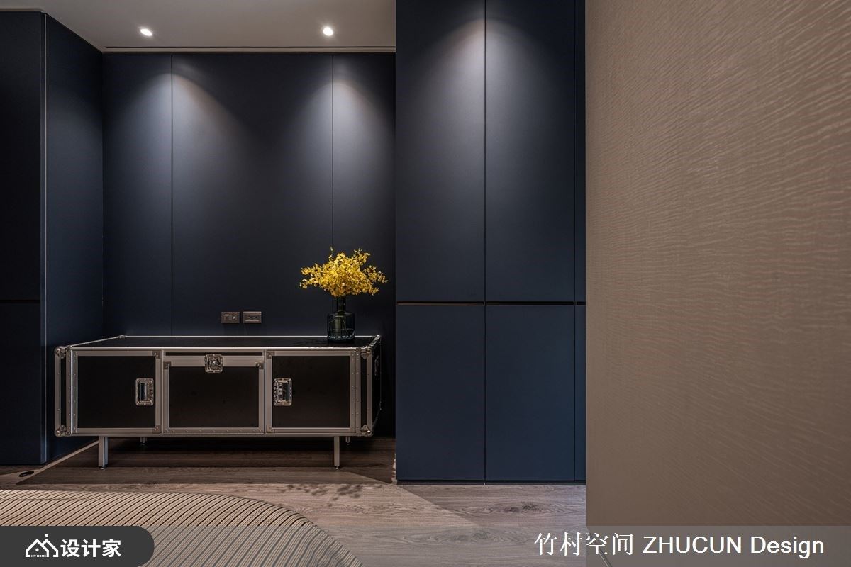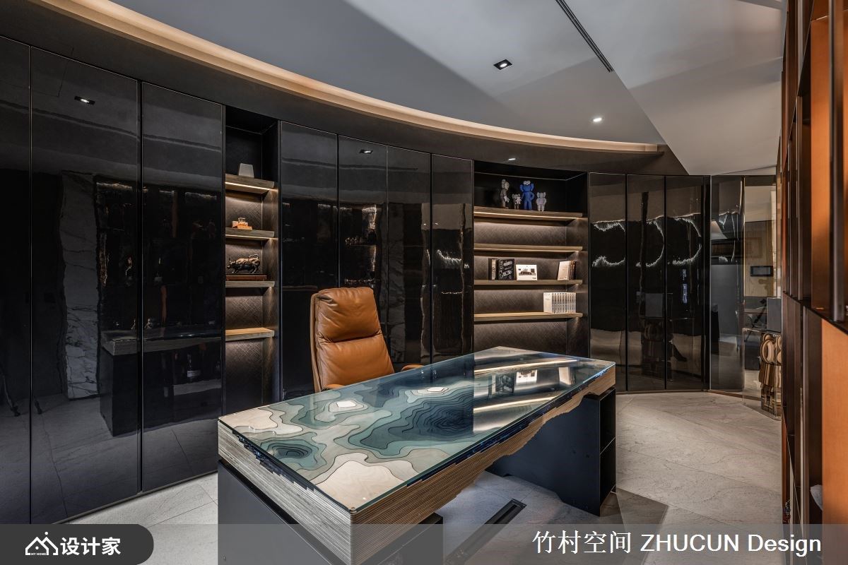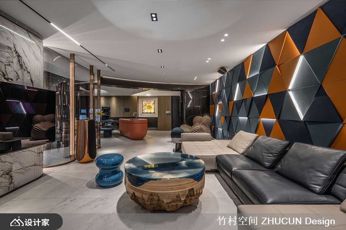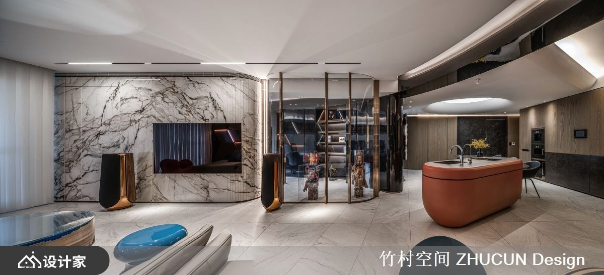 此案为227.7平米现代宅,原先商品化的房型并不符合屋主一家的期待,更无法植入一家三口的生活方式,竹村空间 魏立彦设计师 透过重整格局、善用质材,佐以间接光源辅助,并适时虚化某些空间的接口,保留变换为实体的弹性,以精湛手法展现虚实交错的设计模式,成就一所流动如生、时尚现代的特色居宅。 场域铺叙轻浅、沉稳的石纹肌理,透过相互交织化身整体基调,其次于立面设计、软装配置上添抹摩登橘、英伦蓝的鲜明色彩,打造时尚利落的现代风格。 舍弃既定的方正格局规划,于客厅、餐厅、书房等公共空间,以不规则、圆弧划分界线为设计主轴,创造如活水般的流动感,更于无形中塑造了弹性多元的行走动线。 为了保留大坪数的开阔感,以清玻璃隔间围塑静谧书房,有效延伸场域的视觉感受,餐厅天花更以圆弧穹顶造型,争取舒适的屋高尺度。
