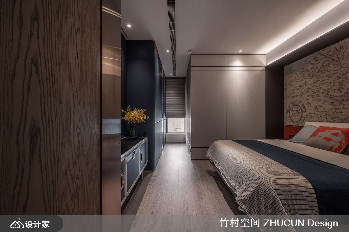 寝卧空间色彩延续公领域的摩登橘、英伦蓝基调,形塑富有整体性的时尚居宅。