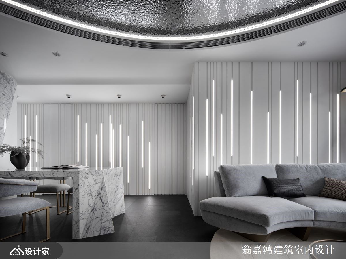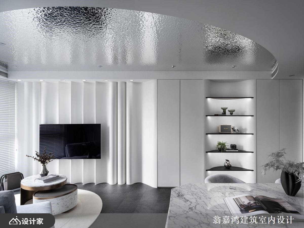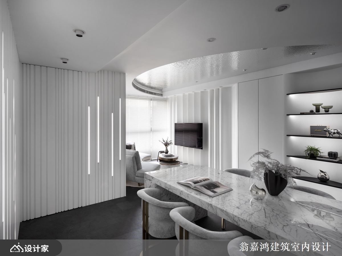 此案为66平米现代宅,格局规划为齐备的2房2厅,屋主为一位不婚主义的发型设计师,在符合居者的使用需求下,更保留场域的使用弹性,而在男屋主心中更有着明确的色彩、材质喜好,希望翁嘉鸿建筑室内设计 能在有限的空间内,实现对未来的美好愿想,且形塑一处美学机能并具的艺术居宅。 以一道渐进式立体波浪墙,衔接起玄关与电视墙的互动关系,中段的内凹空间设置薄铁层板,佐以间接光源辅助,屋主可自行展示精美收藏,让此处化身入门的居家端景,而为了拟态电视墙的丰富表情,选择可弯板的质材,透过现场放样比对最合适的曲线,塑造量身订做的视觉主墙。 以男屋主最喜爱的轻浅白色大理石作为餐厅主角,由立面缓缓延伸至水平台面,桌脚处以新颖的角度造型,描绘现代风内的简约利落,后方立面突破既定印象中的灯光设计,以线性格栅语汇搭佐不对衬灯带,巧妙串联沙发背墙,更藏匿私领域、更衣间及卫浴的门片,于小坪数内弱化场域间的分野。
