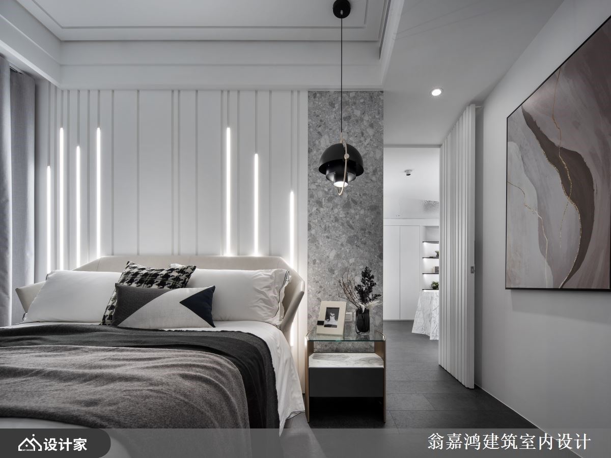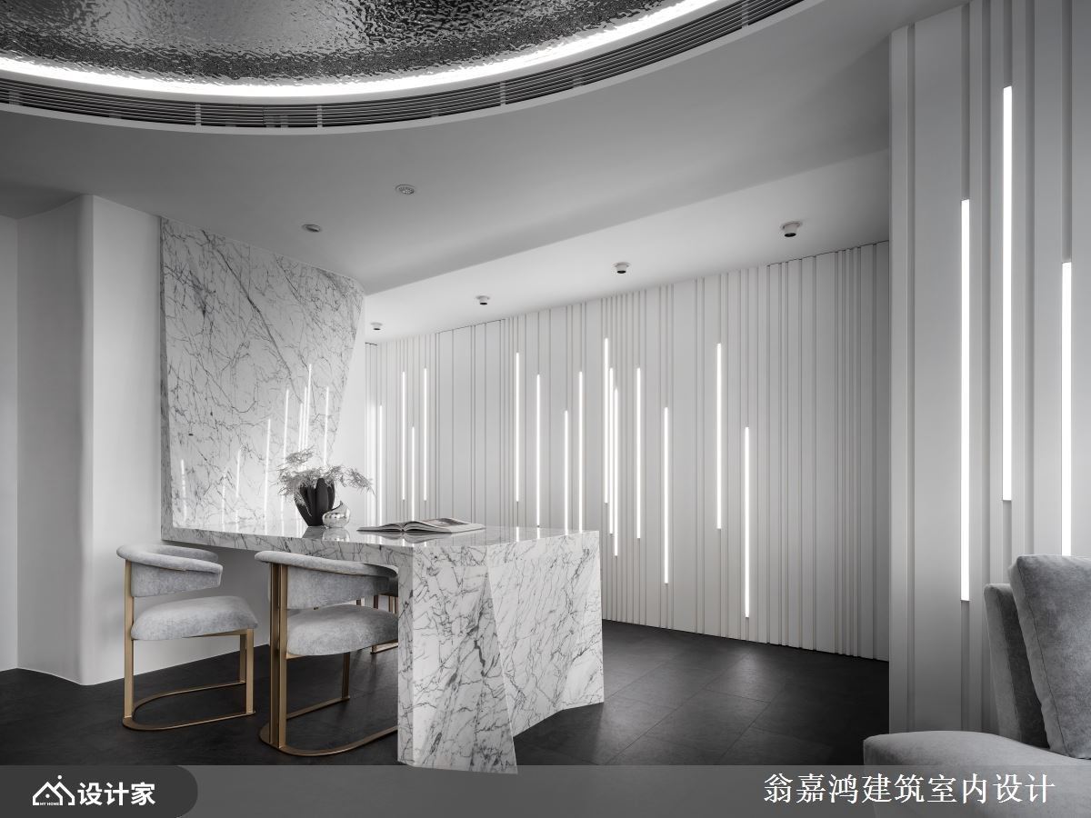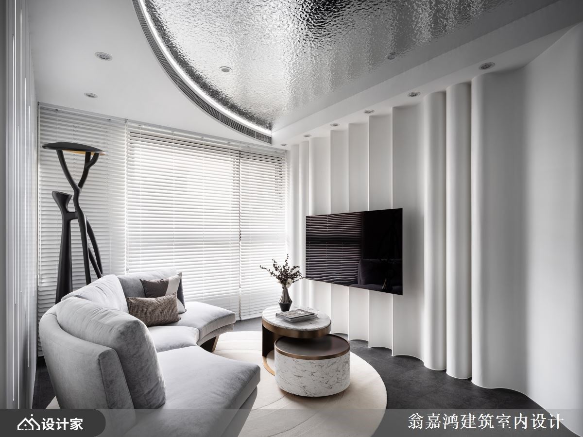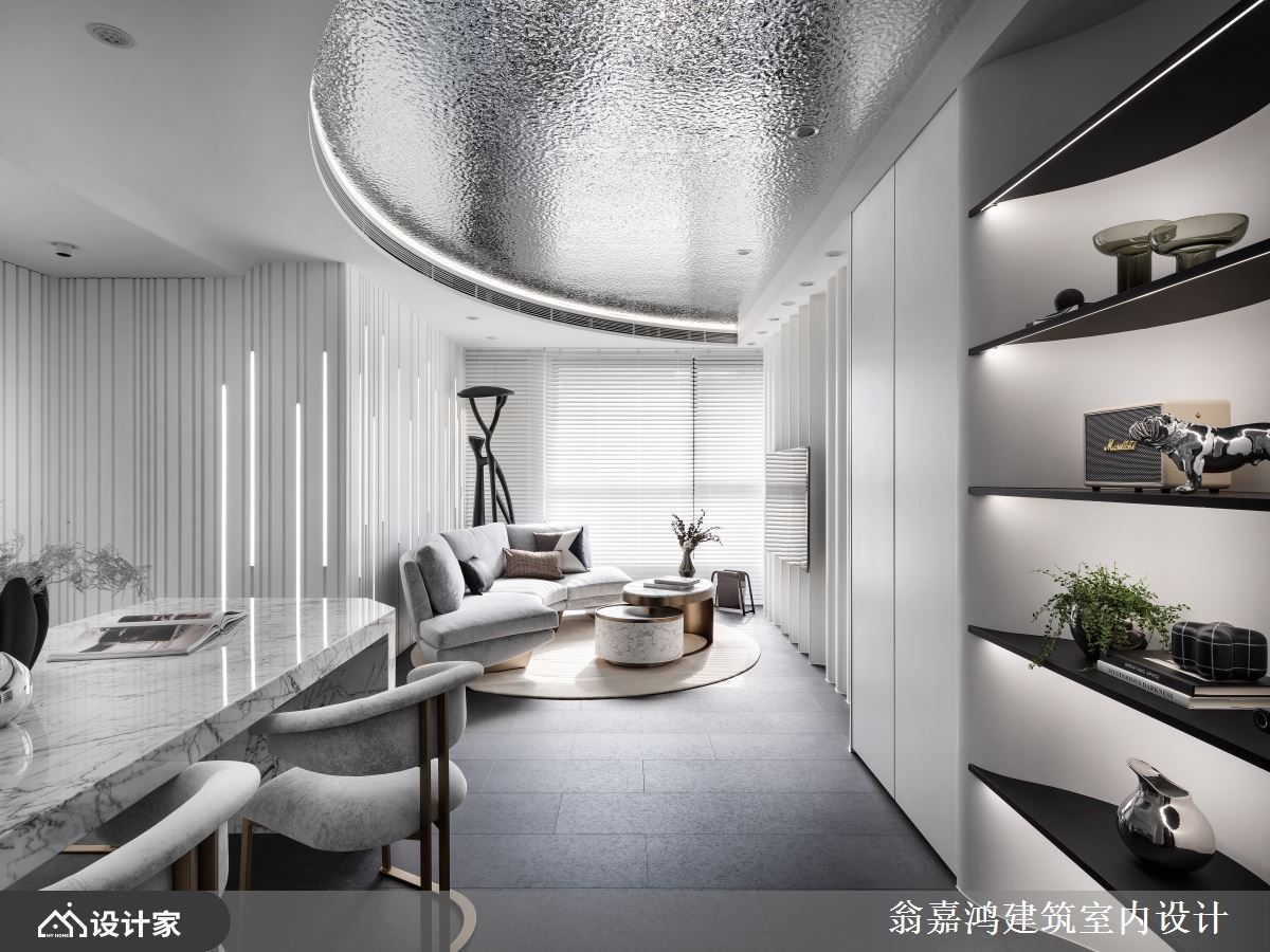 此案为66平米现代宅,格局规划为齐备的2房2厅,屋主为一位不婚主义的发型设计师,在符合居者的使用需求下,更保留场域的使用弹性,而在男屋主心中更有着明确的色彩、材质喜好,希望翁嘉鸿建筑室内设计 能在有限的空间内,实现对未来的美好愿想,且形塑一处美学机能并具的艺术居宅。 以一道渐进式立体波浪墙,衔接起玄关与电视墙的互动关系,中段的内凹空间设置薄铁层板,佐以间接光源辅助,屋主可自行展示精美收藏,让此处化身入门的居家端景,而为了拟态电视墙的丰富表情,选择可弯板的质材,透过现场放样比对最合适的曲线,塑造量身订做的视觉主墙。 以男屋主最喜爱的轻浅白色大理石作为餐厅主角,由立面缓缓延伸至水平台面,桌脚处以新颖的角度造型,描绘现代风内的简约利落,后方立面突破既定印象中的灯光设计,以线性格栅语汇搭佐不对衬灯带,巧妙串联沙发背墙,更藏匿私领域、更衣间及卫浴的门片,于小坪数内弱化场域间的分野。