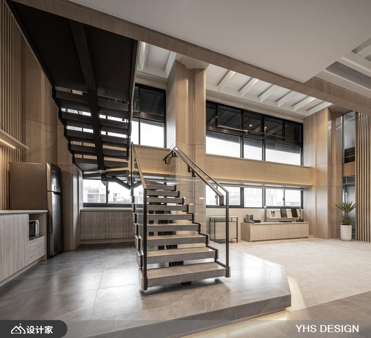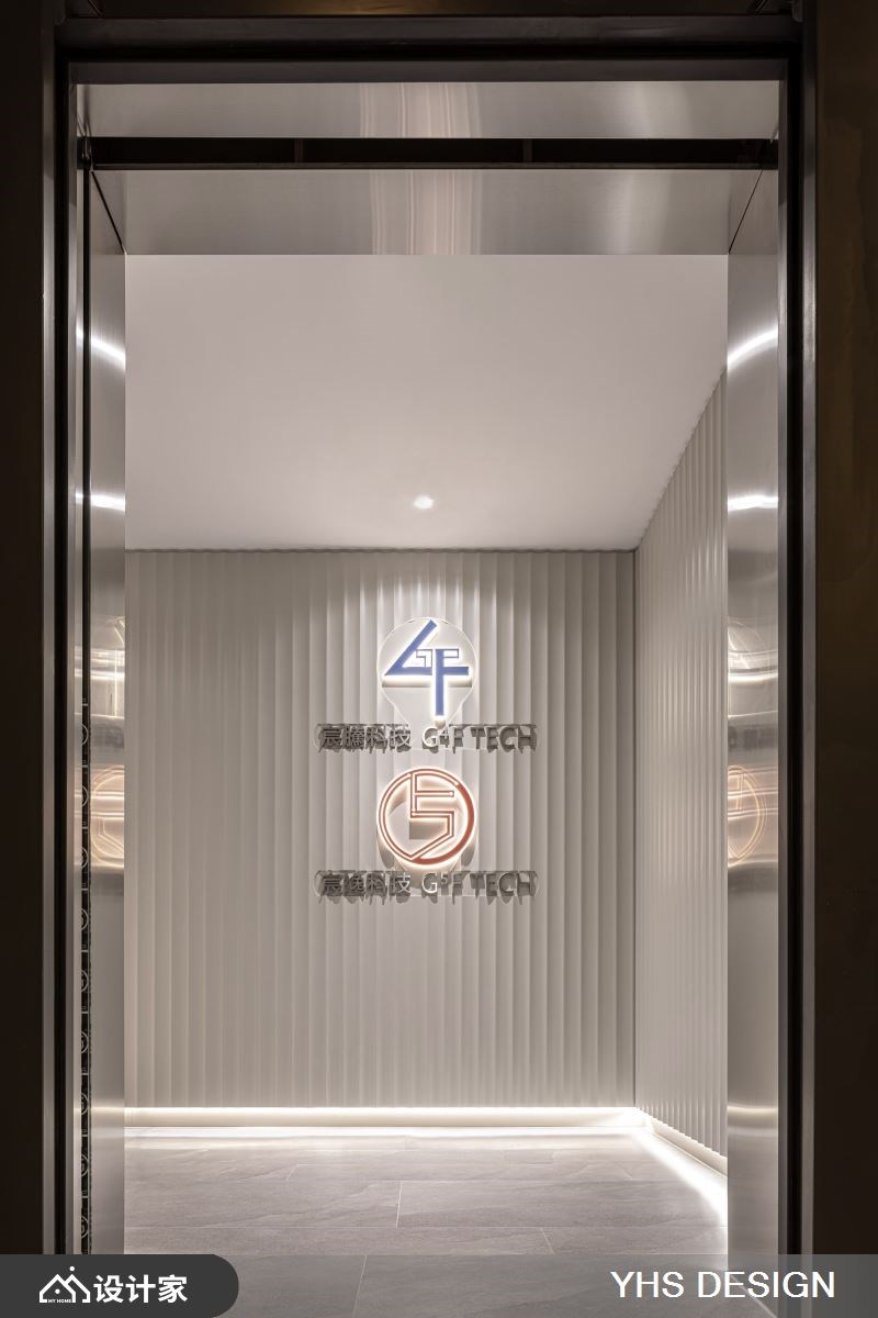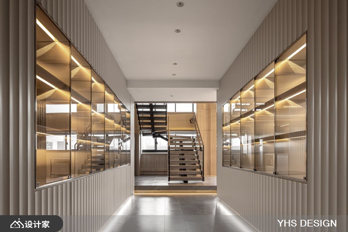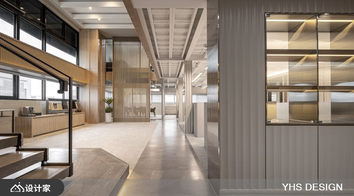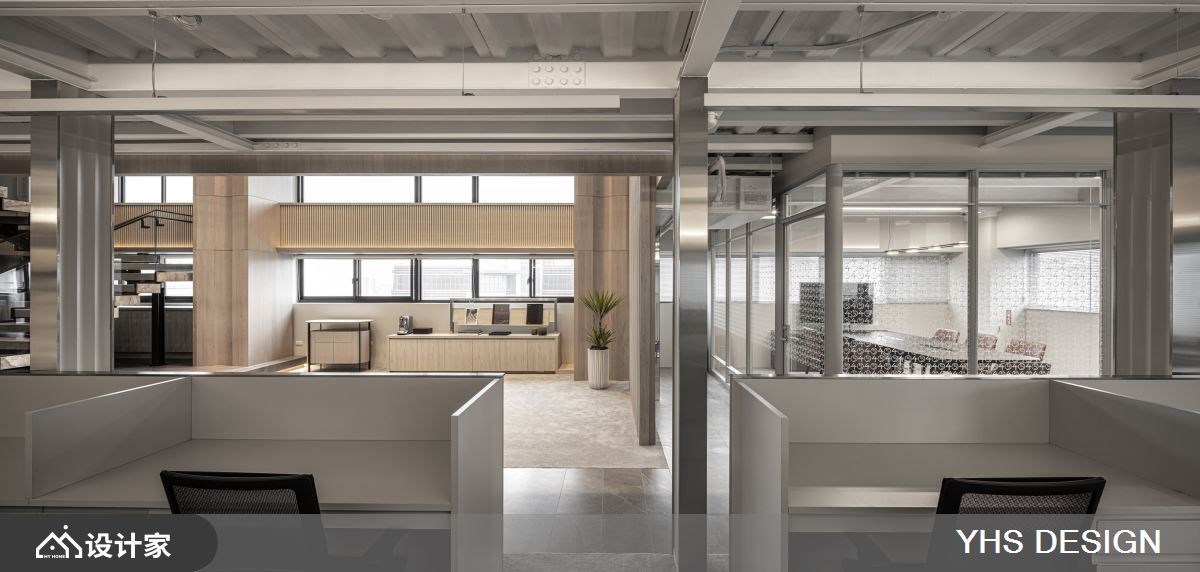 291 平米附层建筑基地为科技公司的新办公聚落,为了符合产业调性,设计师以金属饰板打造门廊,U型浪板搭配间接照明打造入口端景墙,建构出科技业较为理性俐落的氛围。 内部复层大空间,以灰色大理石打底,并延续金属饰板和U型浪板两大现代材质,在开放式办公区做出隔间划分,扭转过往办公室生硬的作为模组与设计。茶水间以格栅元素延伸视觉高度,同时也作为不同机能区域的隔间,兼具隐私又能凸显挑高复层的空间感;墙面曲面板阵列搭配线性灯带引导动线前进,型塑现代简约、俐落科技感氛围。通往二楼的阶梯选择镂空金属搭配大理石造型,将重量与材质做完美平衡,第一阶台面特别加宽打造成平台,让楼梯与空间更完美衔接,同时也使其聚焦成为空间轴心。空间设计空适度的留白,让人工灯带与自然光源凸显挑高空间的优势,将窗景化为办公设计的一部分,提升楼层互动建立流动感受。 小編的最愛 会议室采用玻璃隔间搭配艺术造型铁艺,办公室以吊柜取代落地柜营造轻盈通透感,呈现科技、人文、艺术融合的平衡协调,打造能让造访者全然浸沐在刻意营造的内敛舒心工作氛围。