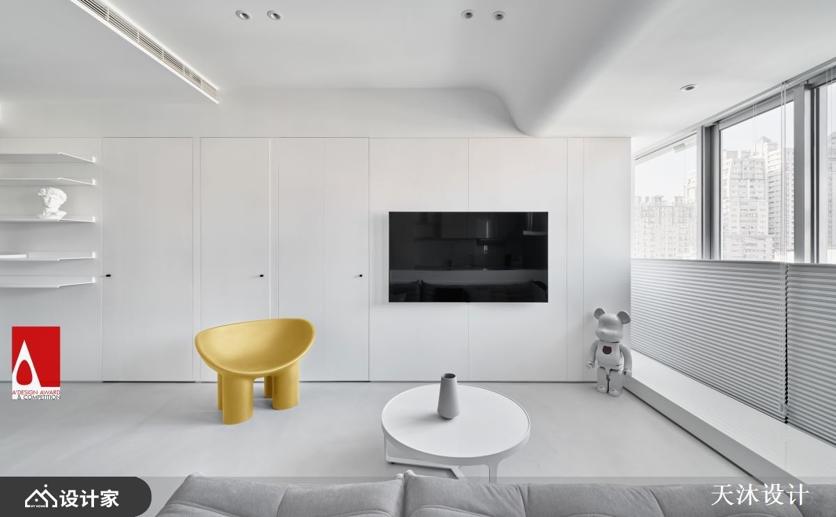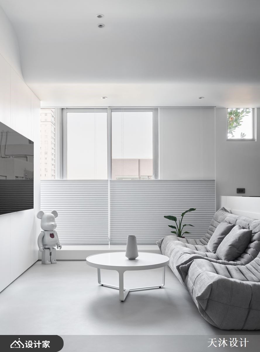 Point 01 75% 的白+无接缝地坪 跳脱以大理石和镀钛金属等建材作为豪宅基底的概念,选择最纯粹的白包覆天花与立面,墙面大面积留白与柜体白色烤漆相连,给予空间纯粹简洁的视觉感受。大面积的白弱化了柜体、天花层次和家具带来的突兀感,将空间中不同量体化为统一的调性;公共区域采用浅灰无接缝地坪消弭地砖或木地板的切割线,以无彩色渐变作为调和空间的染剂,让光影勾勒出生活的轮廓,单纯化的空间让设计退居幕后,透过一家五口的生活点滴在空间累积成家的模样。