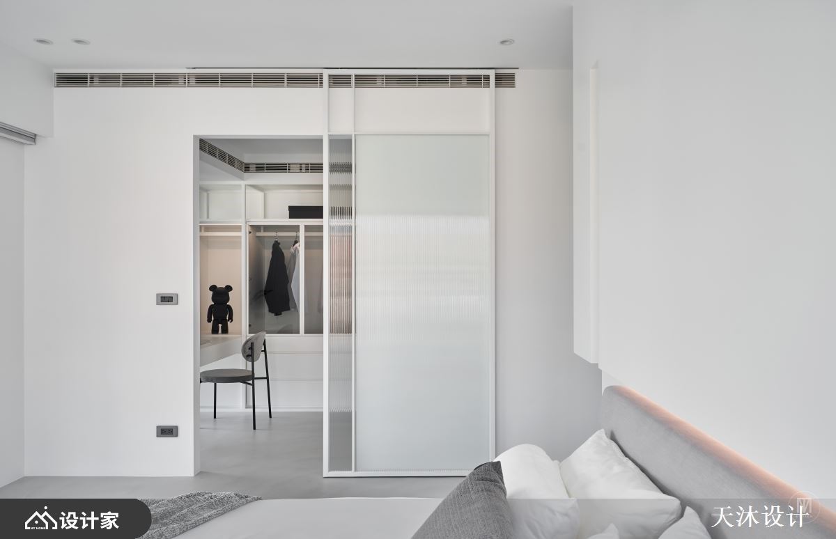 重新分配原本三房空间,改为三间寝居和一间琴房,主卧延续白色调性,并在床头透过解构设计在单色立面创造层次;独立更衣间衣柜采用白铁玻璃拉门,消弭 L 型衣柜的压迫感,但保有充足收纳量,删除繁复装饰反而更能凸显细节,适度留白则赋予生活想象空间,以及保留给居住者的使用与布置的弹性。
