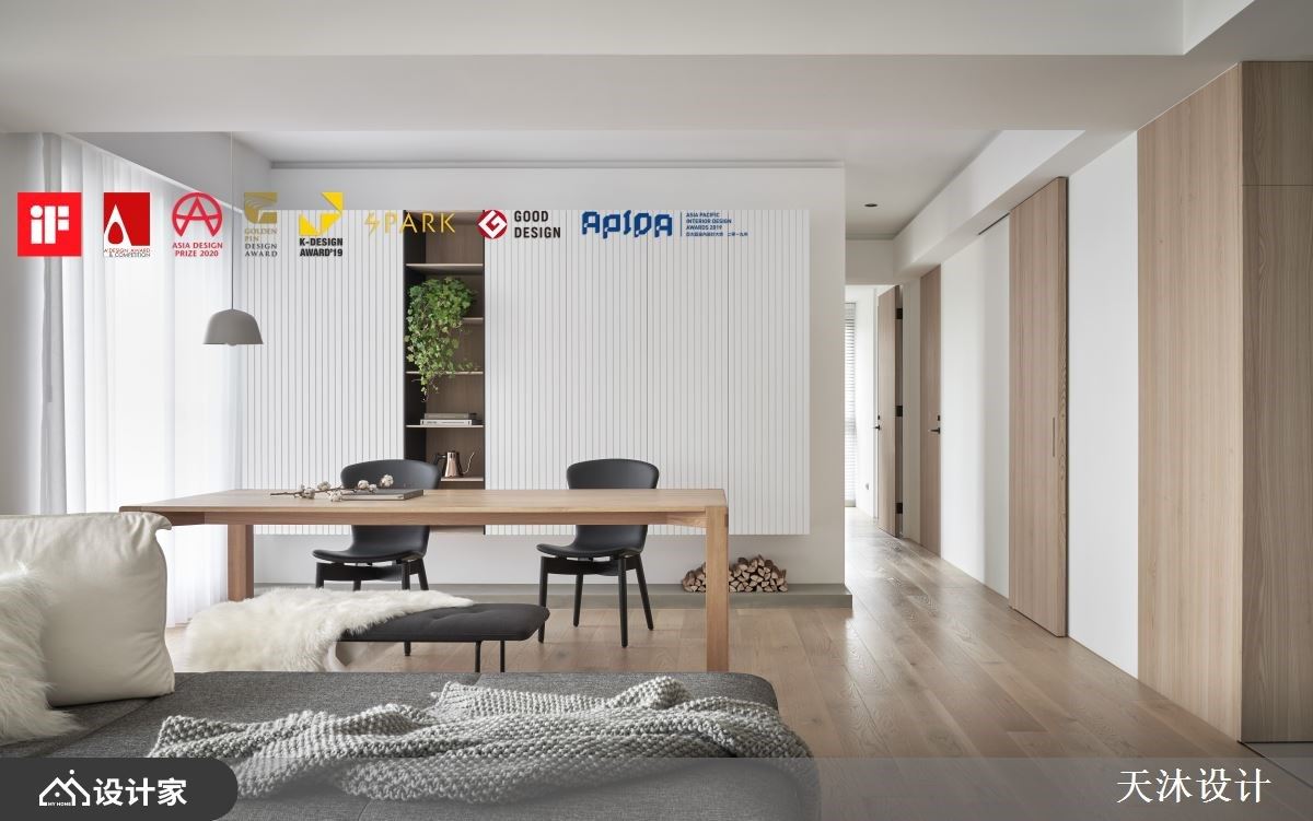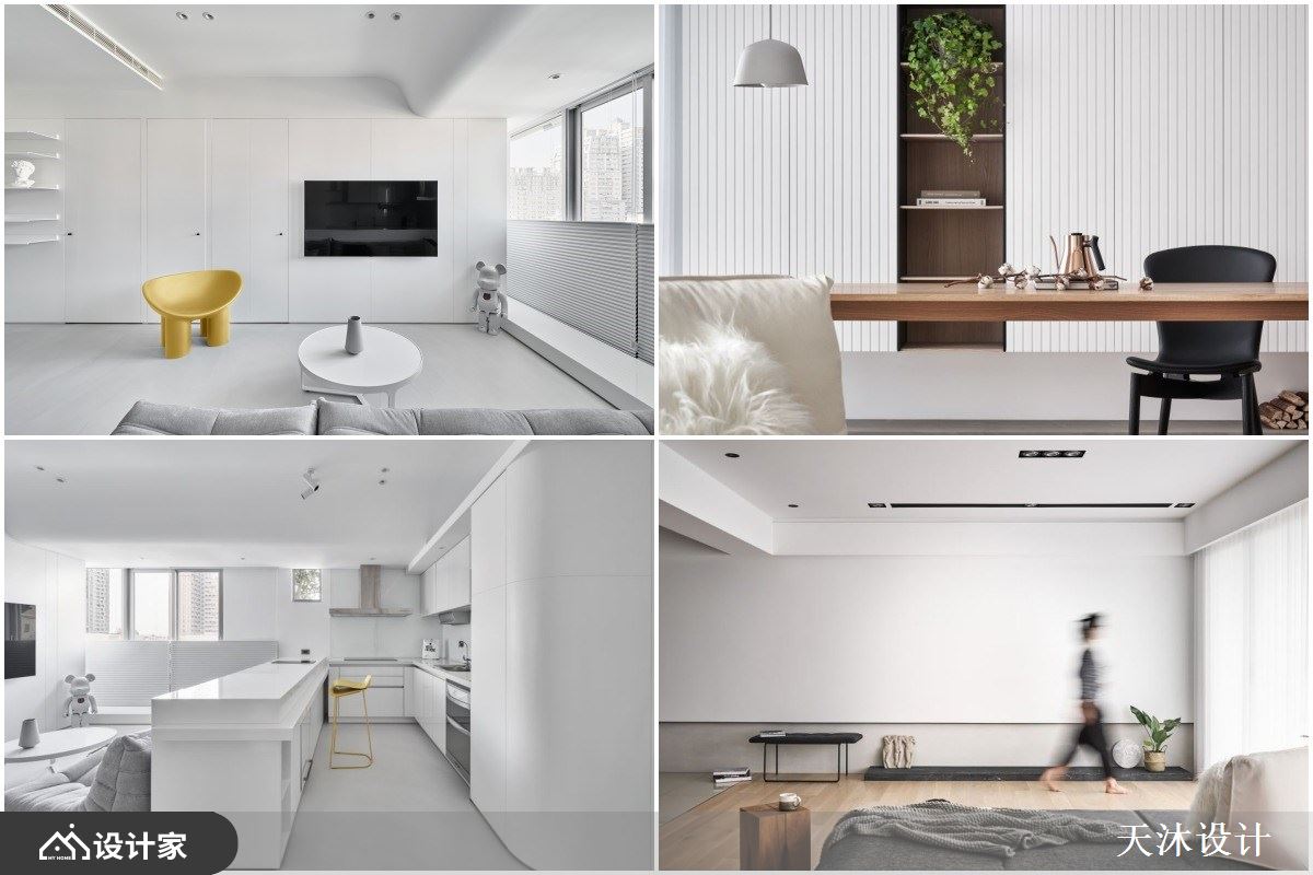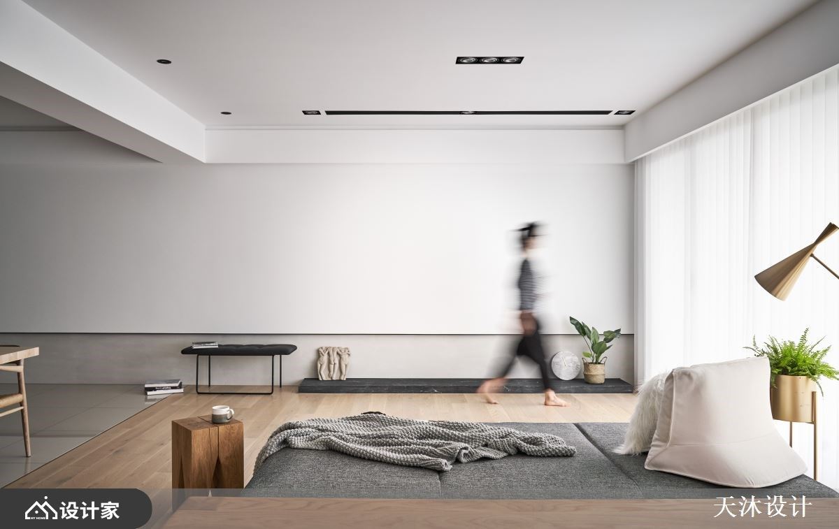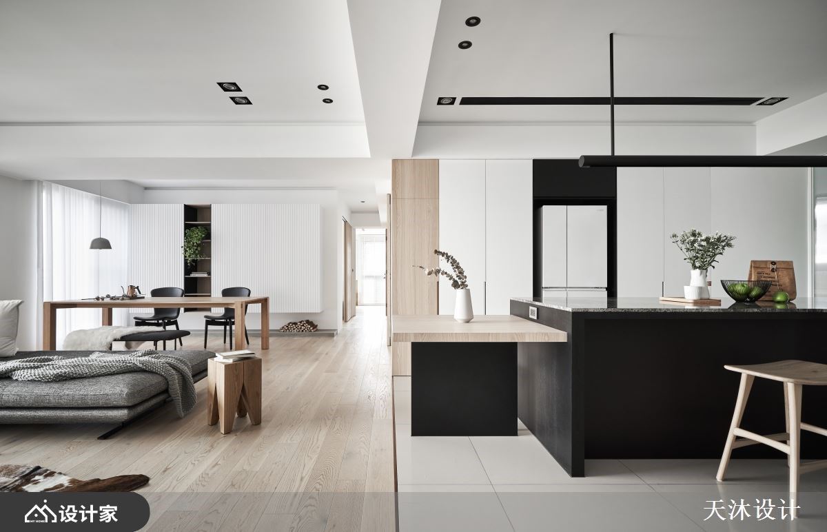 Point 02 大面积材质铺叙+木白黑三原色 拥有采光优势的 165 平米住宅,设计师以白色作为光影的舞台,辅以清水模涂料创造立面变化;客厅铺陈偏暖色的浅木地板并延伸到门片,以块状形式划分房门出入口,透过异材质堆栈营造设计韵律。厨房中岛特别以雾面黑与客厅的纯白做出区隔,透过木质调作为设计桥梁,浅木、纯白与黑色三原色堆栈交错营造与自然接轨的居住空间。