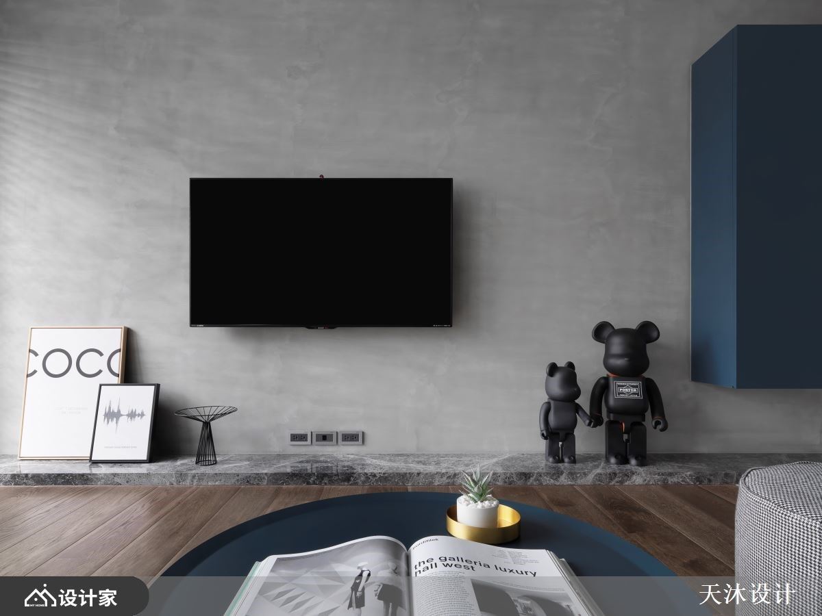 电视牆侧边柜体及书桌檯面选用理性的伦敦蓝色,在黑白灰的空间内挹注一丝清新活力感,不只成为目光聚焦处,居宅个性也更为鲜明。