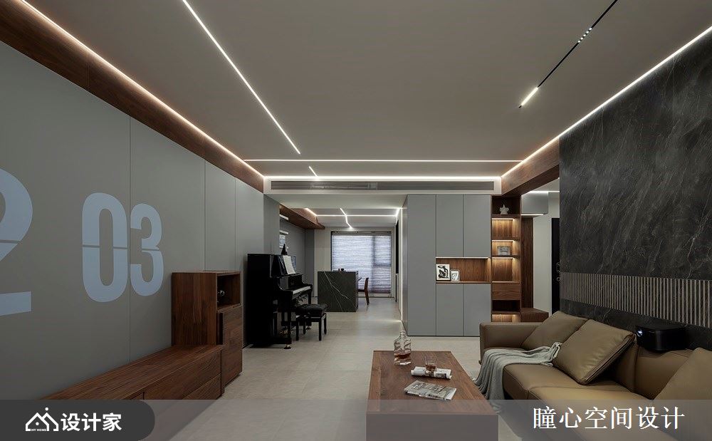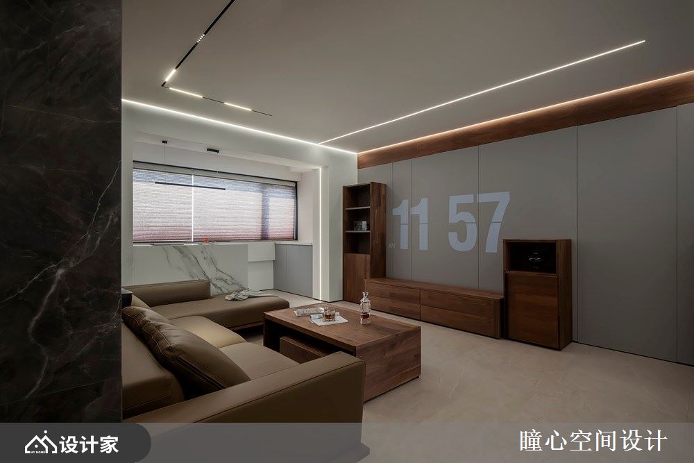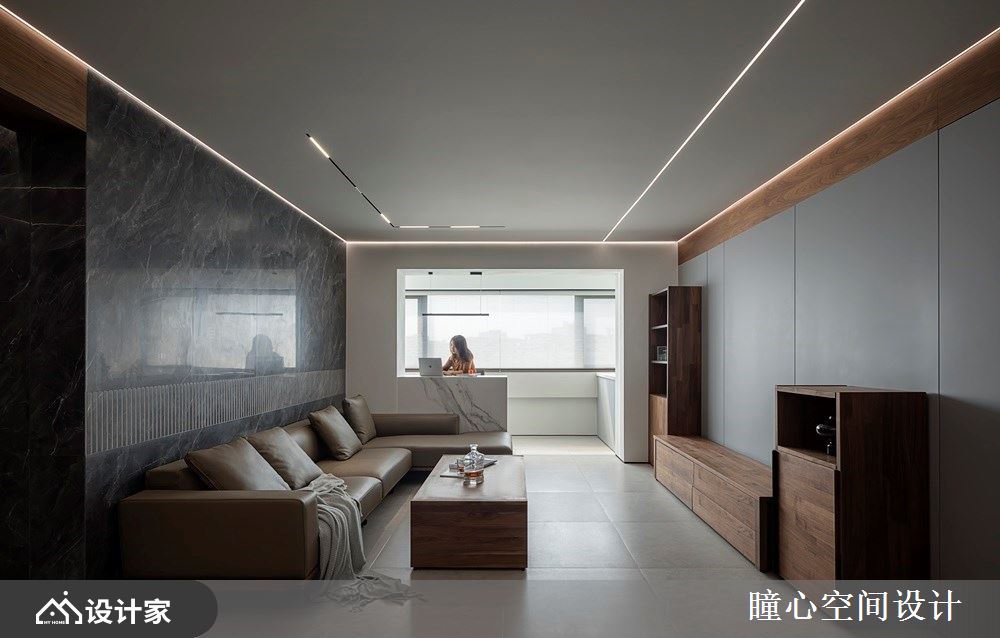 沙发背景墙选用了仿大理石瓷砖,中间做了拉槽处理减少呆板感,无限连纹的石材纹理有着显山不露水的低调高级感。