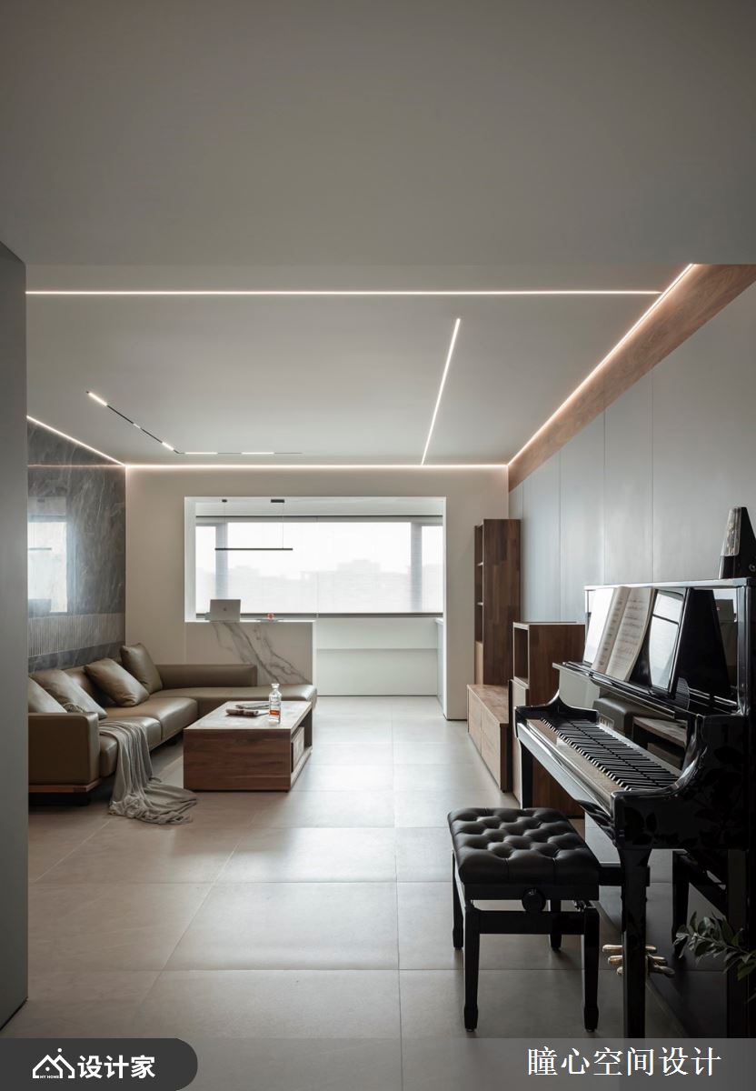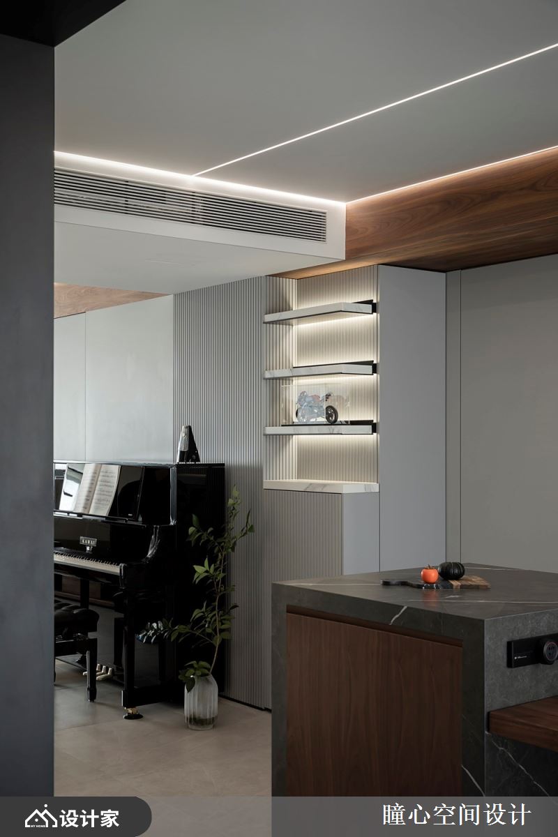 钢琴背后的定制柜一半平面板,一半拉槽板,使得空间过渡不会单调。开放式层板选用了白色岩板,先做钢架再放岩板,灯光一打,氛围感直接拉爆!格栅柜处于房屋中间位,层板下方暗藏着全屋地暖分水器,从这里送温暖到全家速度最快最节能。