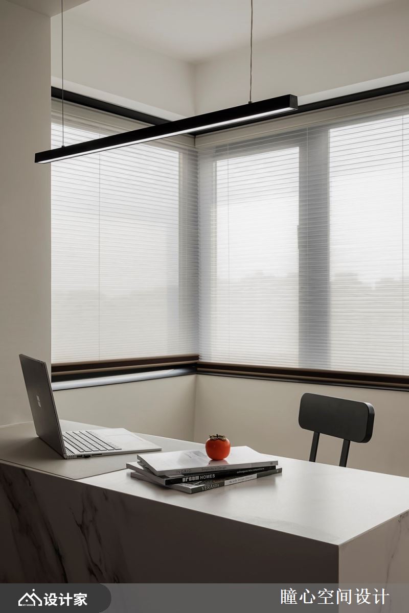 白色岩板在自然光线的照射下,低调中体现精致感,在这里无论喝茶亦或办公极其舒服惬意。