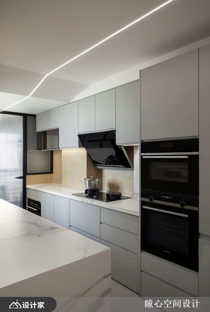 浅灰色厨柜搭配白色岩板台面,尽显精致格调。顶面蜿蜒的吊顶和线性灯,也让空间更有层次。