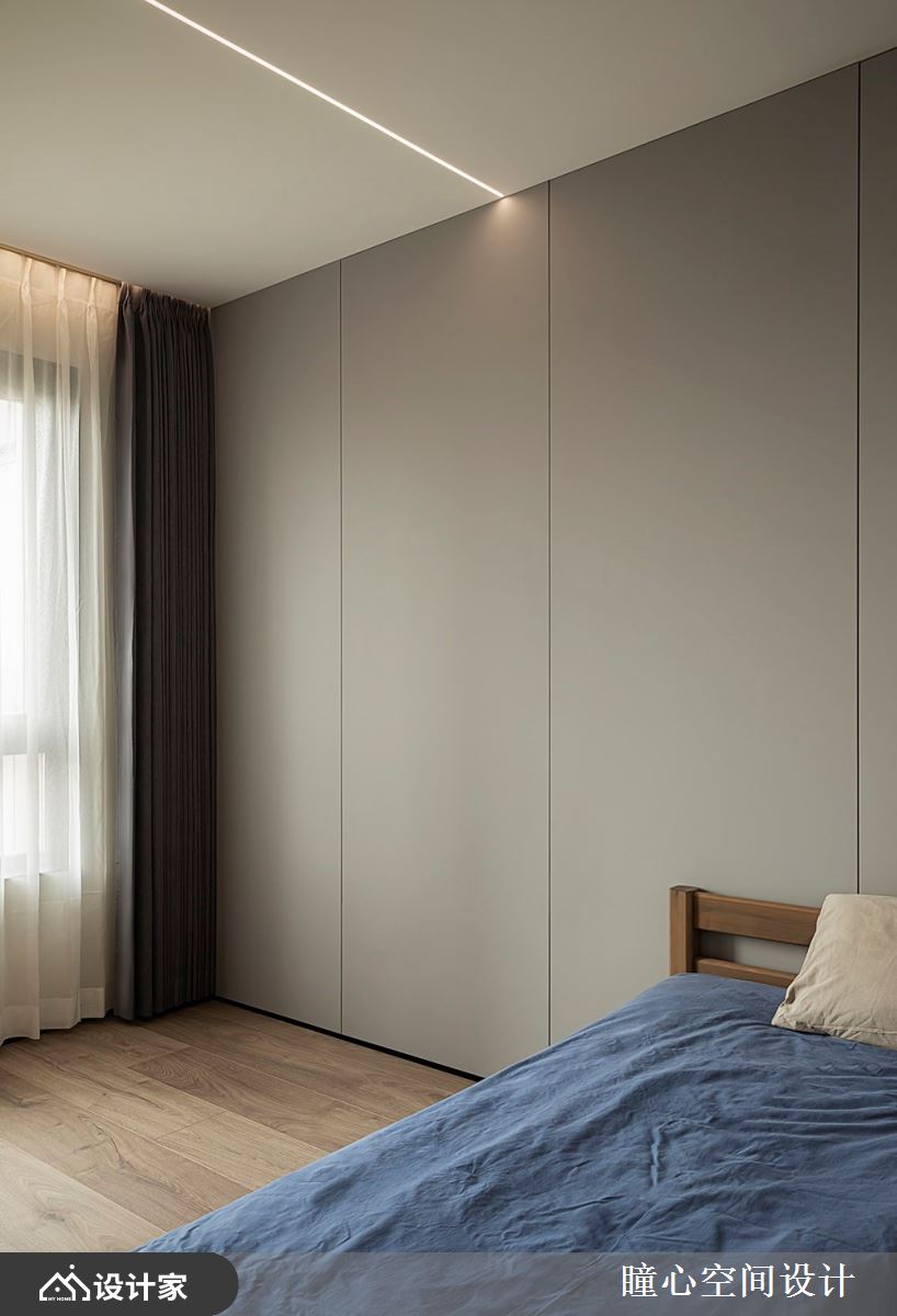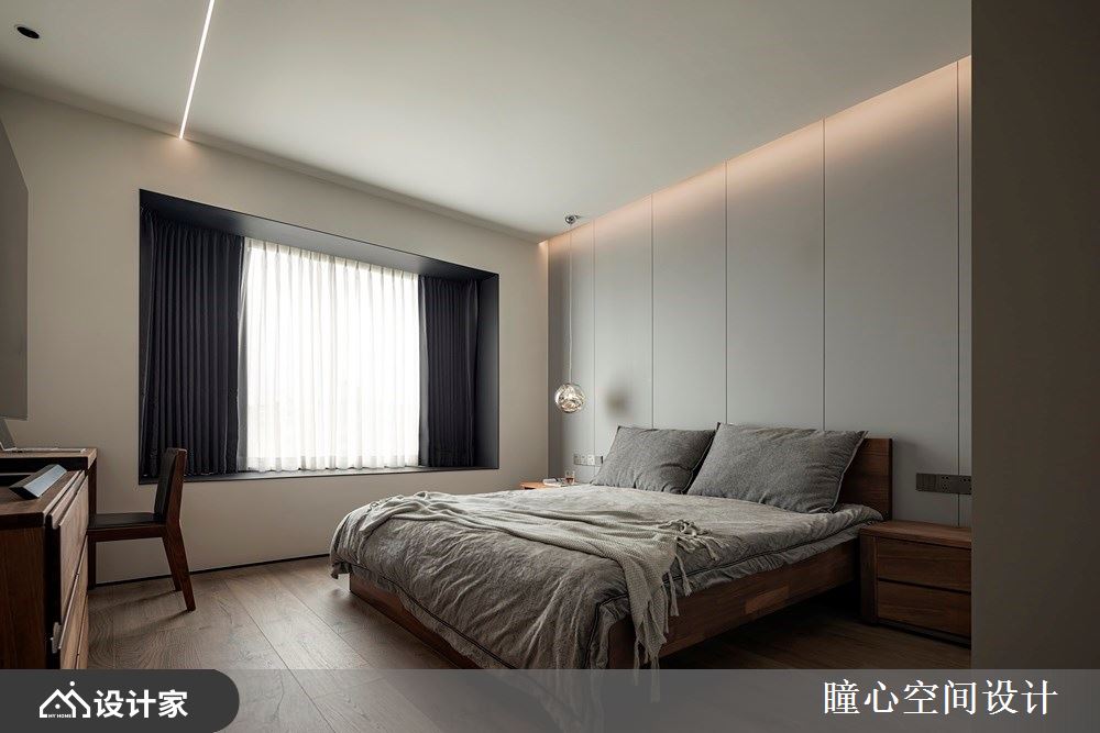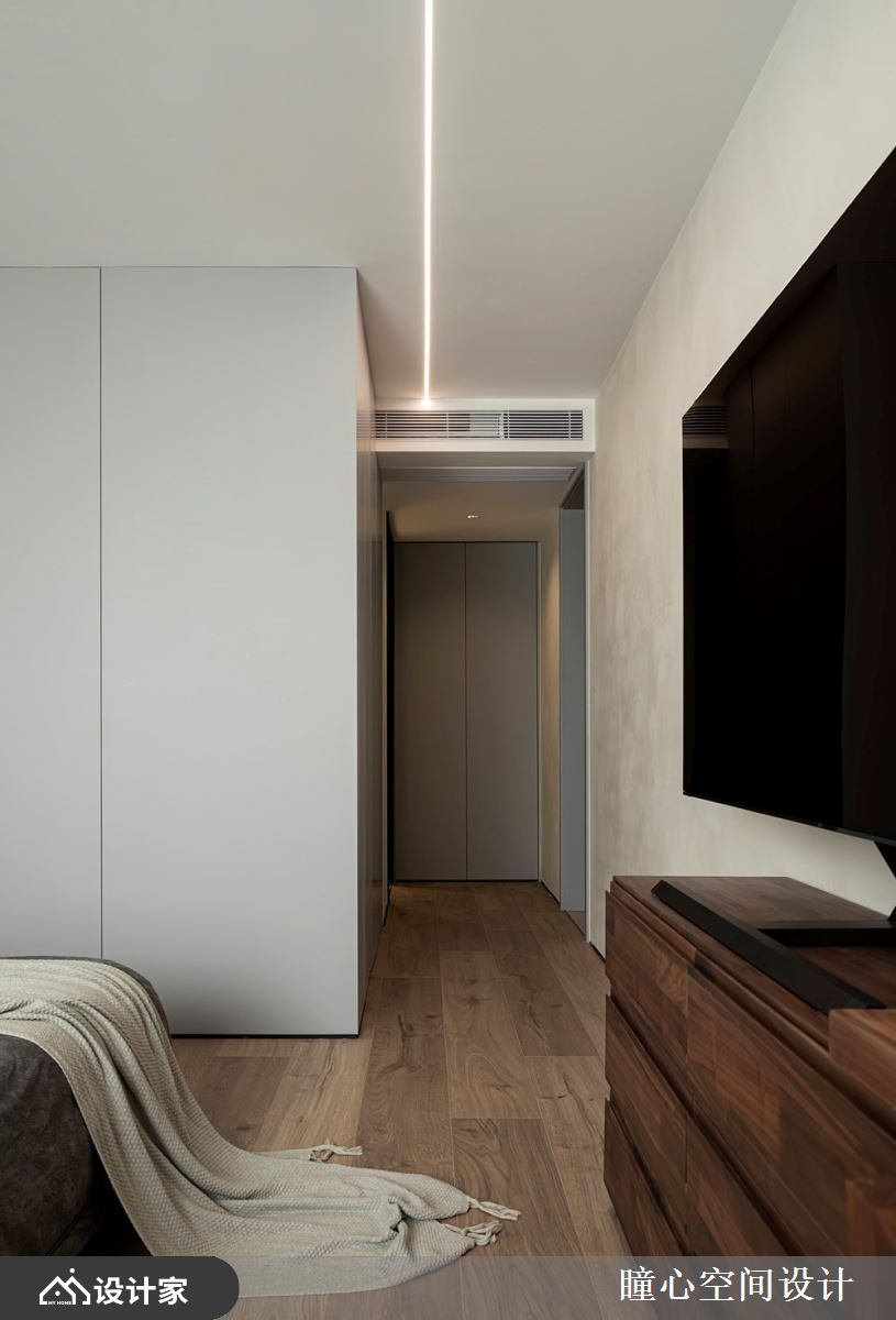 木地板选用比黑胡桃木浅一度的原木色,与微水泥灰色墙面、浅灰色衣帽间搭配在一起,仅仅用极少的色调就调和出舒服的配色,让主卧变成温暖的灰灰世界。