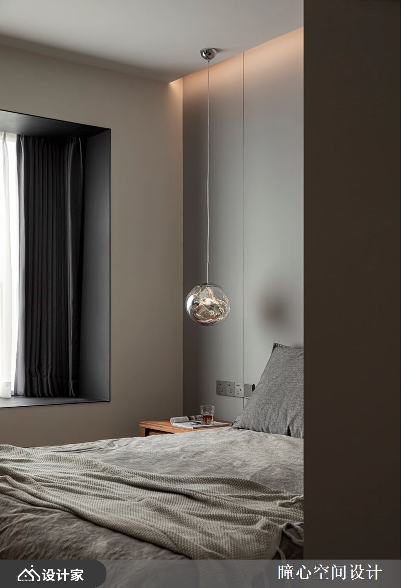 床头背景墙选用与其他空间一致的浅灰色木质板,易清洁而且延续一惯性。