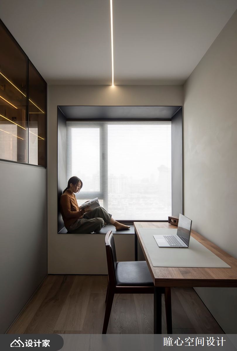 次卧空间虽小,但是用来当男业主的书房绰绰有余,黑色不锈钢窗框增加空间层次感。