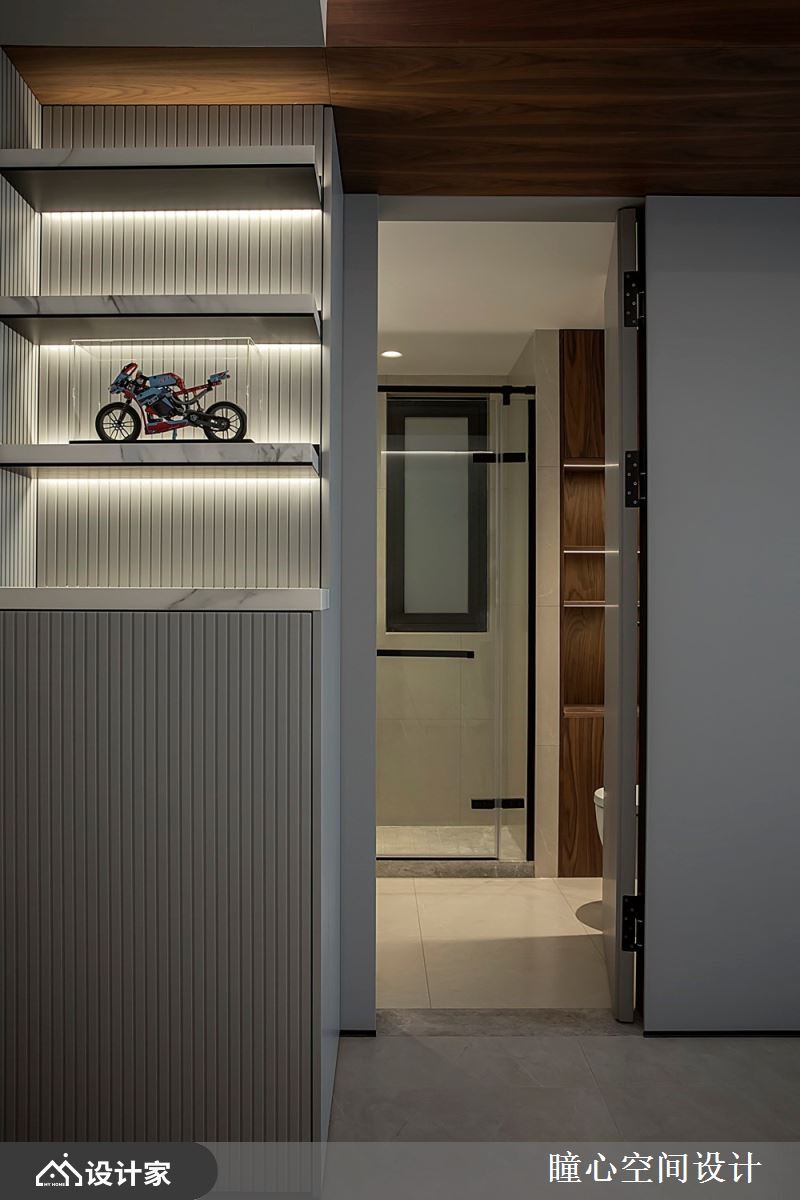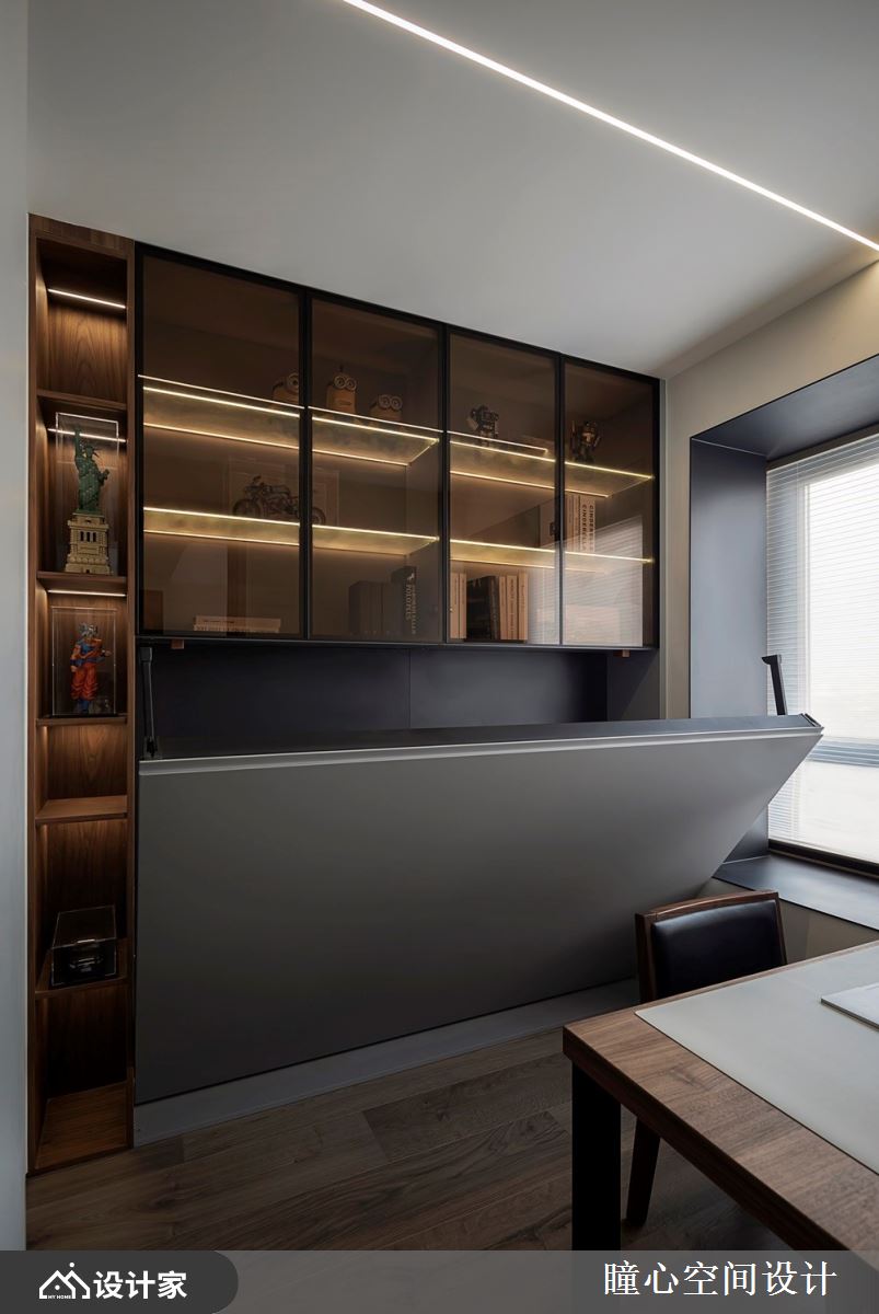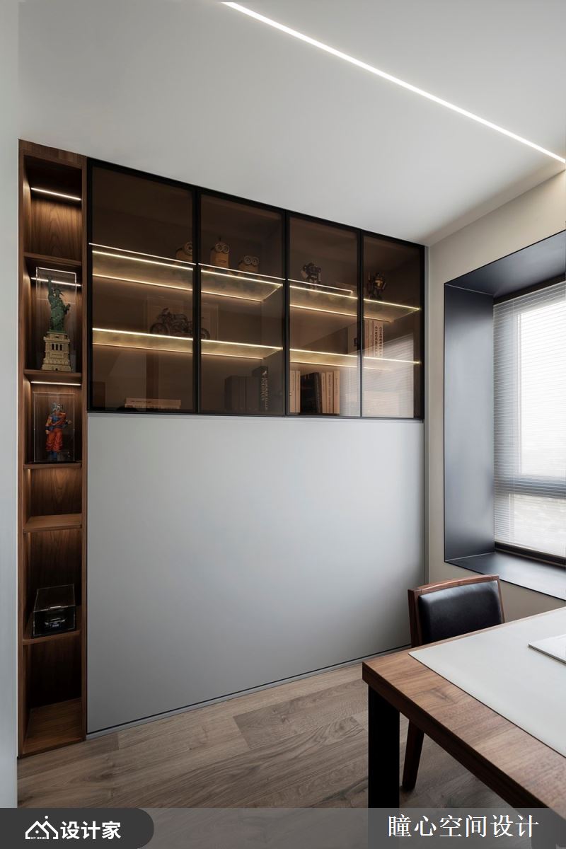 翻板床一拉一合之间,如果有客人来访,还可以当做一间独立使用的客卧,但更多时候是男业主加班累了,不想影响家人,可在此做简单休憩。透明茶玻的展示柜,收藏了各种心爱的手办。