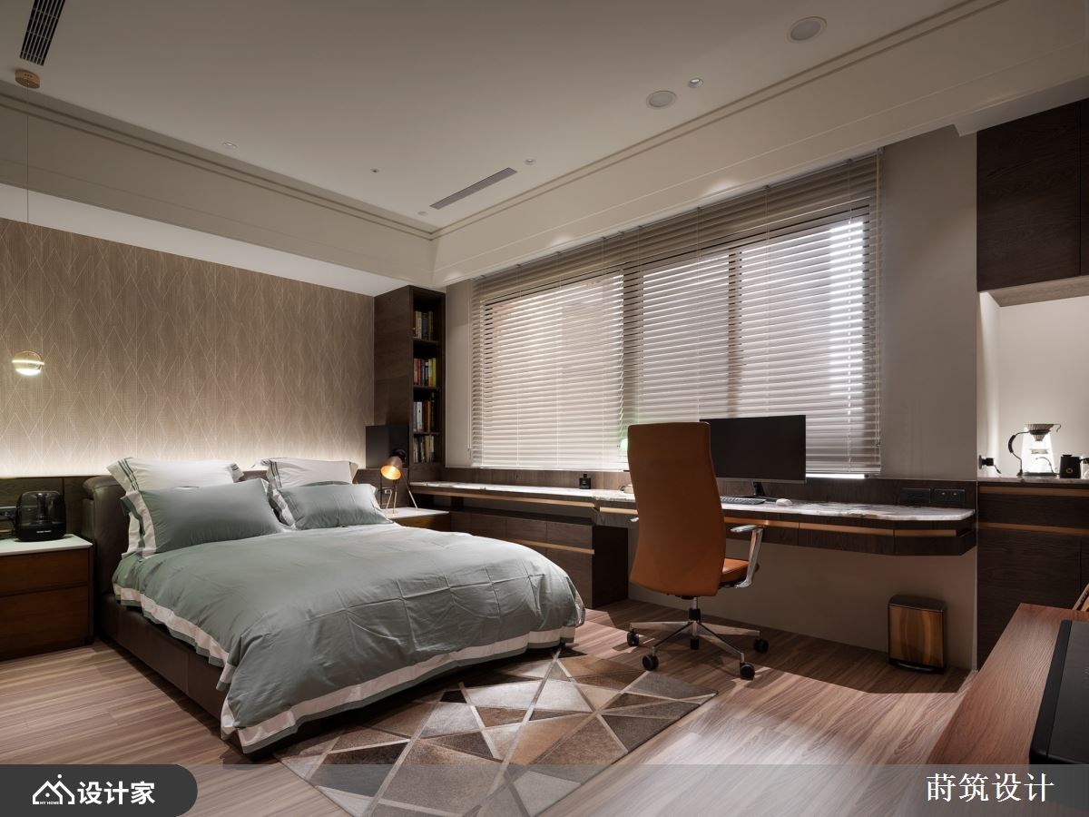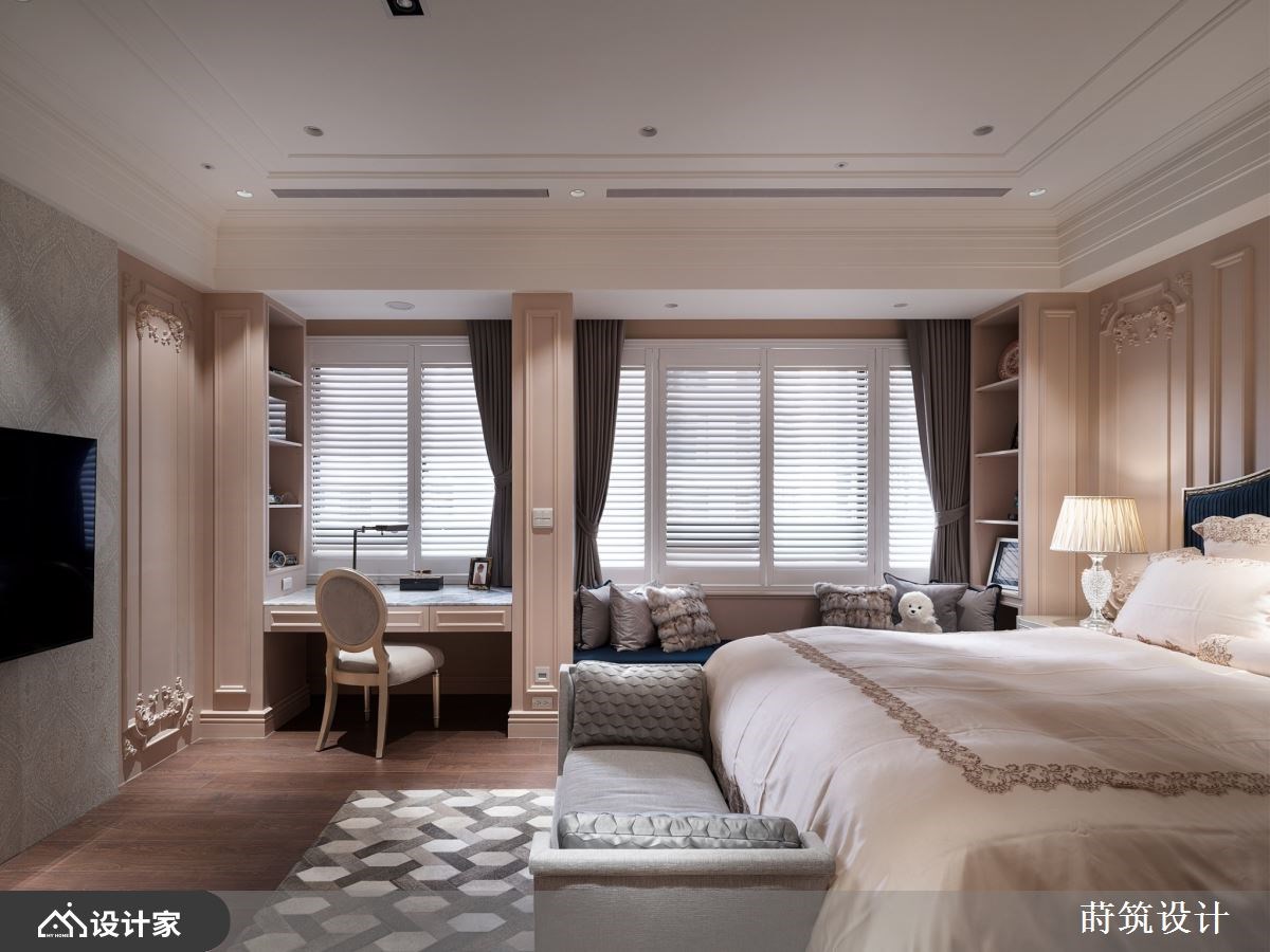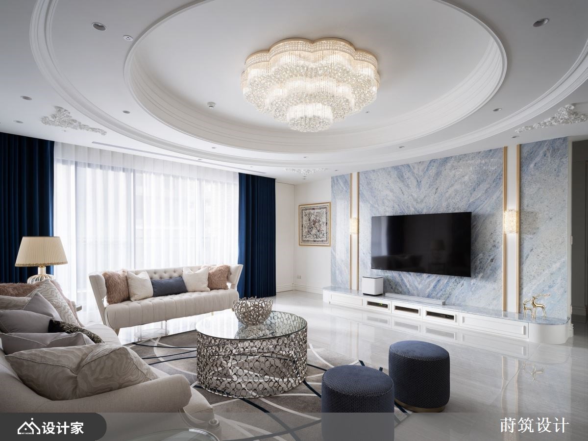 58 坪的空间中,保留了宽敞地坪打造玄关长廊,欧式古典镶边的地坪给人清新印象;两侧除了规划海量收纳外,更将电子衣橱隐藏于柜内,粉蓝色调与纯白线板点;廊道尽头略带透光感的海洋之星大理石形塑唯美端,缀寓丰富实用机能于美型设计。 考虑到一家三口使用性与公领域空间感,格局上删除一房扩大厅区,开放式空间利用不同花纹与色泽的义大利磁砖来界定。客厅以浅色调为基底,营造明亮开阔的视觉体验,电视主墙材质呼应廊道端景墙,两侧金属饰条镶嵌壁灯诠释对称古典美学。沙发背墙依循对称设计,中央铺陈蓝色大马士革图腾墙纸,搭配天花板圆弧形线板垂直延展空间尺度,与水晶吊灯结合营造出典雅高贵的空间氛围。 餐厨区域改为深棕色义大利磁砖,无接缝设计不仅提升安全性、更拉近场域间的距离;餐厅区选择普鲁士蓝包覆柜体与局部墙面,天花板圆弧线板也加入金色漆料,定调出稍微正式的用餐环境。餐厅与厨房之间设计活动门,镀钛金属与长虹玻璃材质精致且能保有隐私和透光性。 小编的最爱 主卧室女主人最爱的粉色调,在床头与柜体上装饰古典线板,两侧分别规划包包展示柜与飘窗,床尾精巧的绒布沙发形塑舒适的私人寝居。男孩房特别规划廊道化解风水疑虑,深色的木质调沉稳而内敛,除了窗边长型书桌外更规划迷你茶水间升级实用机能。