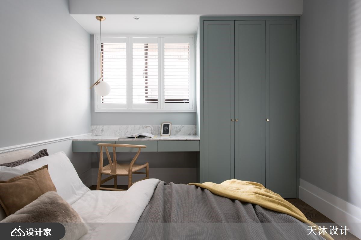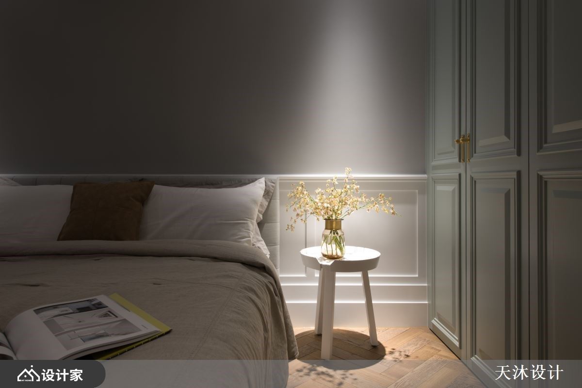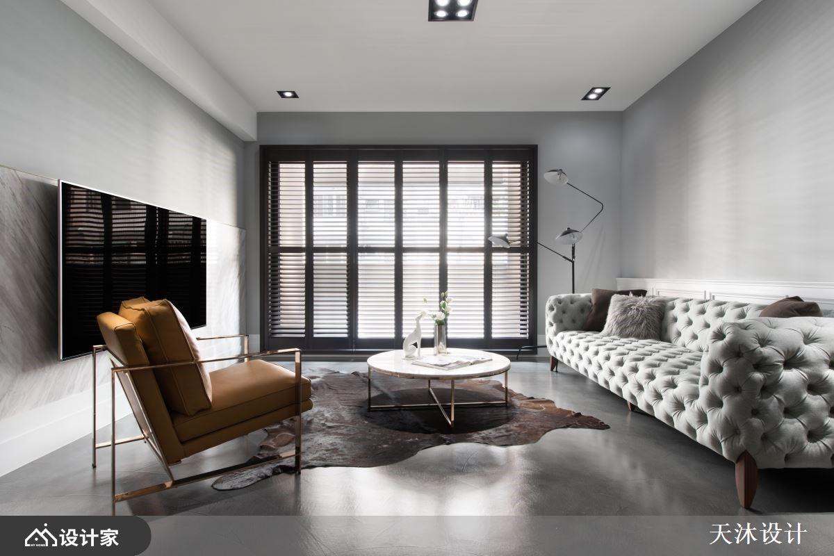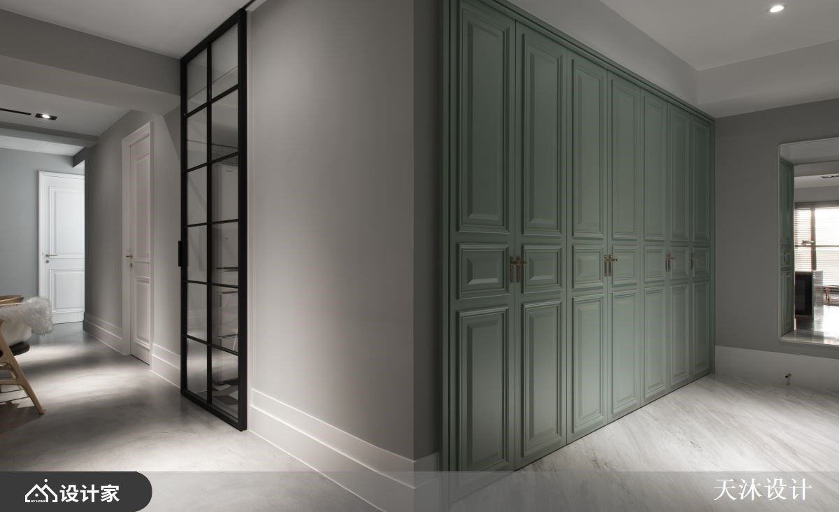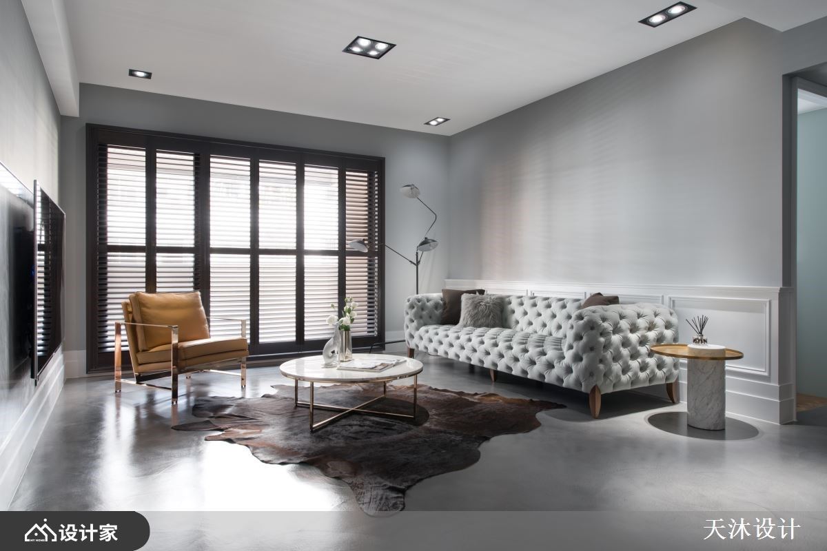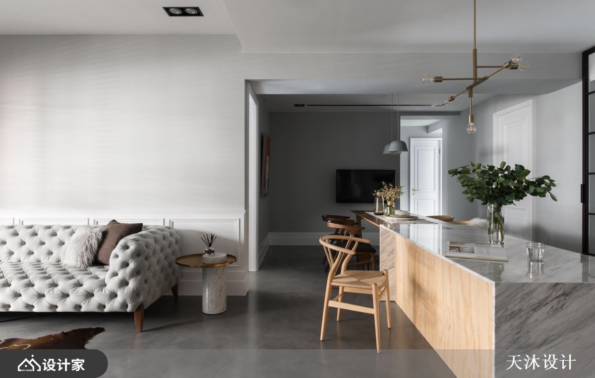 158 平米 / 美式风 / 新成屋 / 两大两小 / 四房两厅两卫 Q1:如何形塑风格却不失去可变动性? Tips:仅用经典美式元素勾勒重点 屋主一家过去在美国生活很长一段时间,希望在台湾的住宅也能融入熟悉的美式元素,但又不想繁复装饰影响空间感,因此天沐设计藉由简约线板设计装饰电视墙、沙发腰墙、门片与空间收纳柜;在细节运用进口铜制手把、皮革五金等,勾勒出简约却不失独特性的美式居家氛围。地坪运用三种材质:玄关银狐大理石、客厅灰色盘多魔地板与卧室人字拼海岛型木地板,衬托屋主搜藏的家具软件,能随心情和季节更换单品与摆设方式,形塑开阔无压的现代空间。