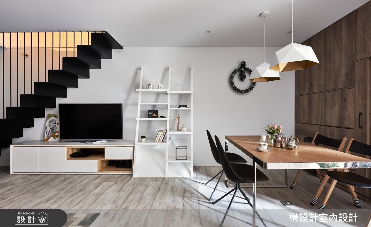 >> 绝招:超强收纳储物柜,电锅烤箱收纳於无形 针对 12 + 12 坪的小坪数阁楼空间也能好好享受烹饪好时光!阁楼的特色在於公领域(客厅、餐厅、厨房)与私领域(卧房)的彻底分界,所以此案面临到的问题便是如何在 12 坪空间内打造完整的LDK。 首先为了彻底释放空间感,设计师特地在餐桌旁规划「超低存在感」的收纳储物柜,平时状态是一片木质墙面,但隐藏开合式的掀柜台面将电锅、烤箱彻底「变不见」,连红酒柜也是藏於墙面之内,这样一方面不担心家电色彩、外型风格和室内空间是否协调,二方面也能维持餐厨空间的简约俐落感。 除此之外,家具部分使用北欧品牌 BoConcept 的经典单椅 Ottawa Chair,搭配木制餐桌椅及木质感收纳柜,清新温暖的北欧生活 hygge 就此展开! **美型餐厨关键字: #小坪数 #北欧风 #北欧品牌家具 #隐藏式收纳