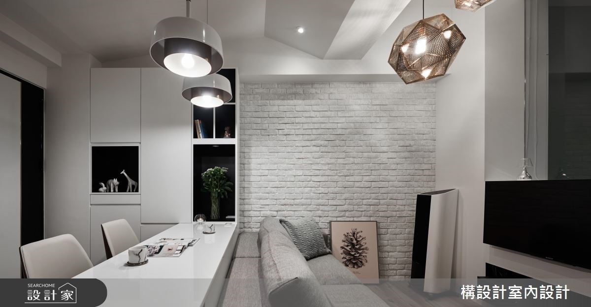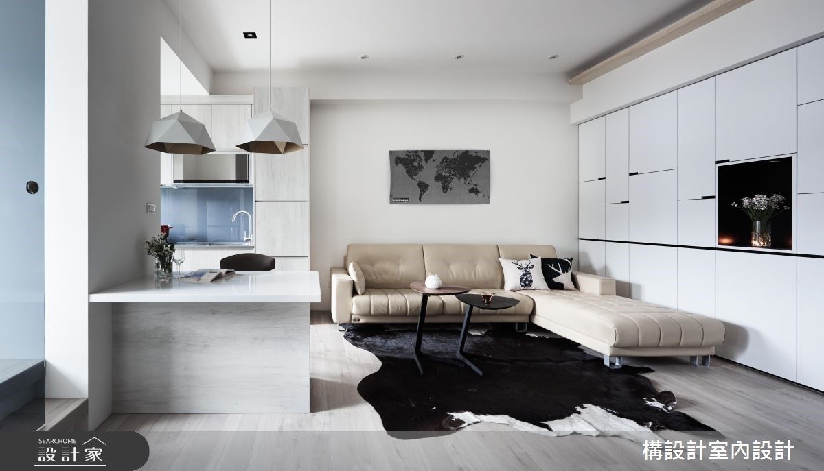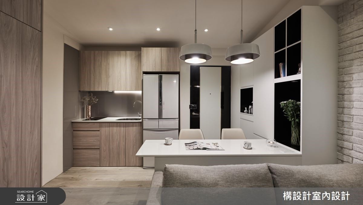 >> 绝招:电器柜、零食柜、收纳柜做起来! 面对迷你住宅案,该如何节省坪数、提高坪效呢?构设计将沙发後的空间整合成办公书房 + 餐厅 + 厨房的多元机能,无墙隔的开放式格局让空间保持通透视觉感,藉由客厅文化石墙的白色系延伸出纯白柜体、白色餐桌,木地板也和木贴皮橱柜有着相辅相成的温润无印风底蕴。 善用垂直空间也是发挥坪效的设计巧思,转角高柜除了可放置电锅、烤箱,同时也是零食柜,兼具电器柜的大容量柜体发挥小套房家庭的最大收纳效果! **美型餐厨关键字: #小坪数 #套房厨房 #电器柜很重要