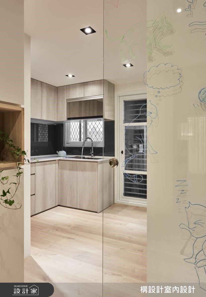 >> 绝招:用玻璃厨房让猫咪安心不无聊 猫咪个性千百种,除了冷酷傲娇之外,也有十分黏人的爱撒娇猫猫。针对爱下厨单身屋主的装潢需求,构设计特地厨房与书房之间运用「玻璃」作为隔间介质,除了玻璃拉门之外,冰箱旁更保留有一个「玻璃盒子」,搭配三层高的纸箱屋,猫咪待在书房空间能如同观景台般能看着主人下厨烹饪,在看见与被看见之间,延续互相陪伴的温度。 对於餐厨空间的风格营造,暖心木质感贯穿餐厅厨房,木地板、木柜与纯白色系,诠释如同日剧般的日式无印风格,展现俐落线条与简约派的生活态度。 **美型餐厨关键字: #爱下厨 #单身宠物宅 #玻璃门在有与没有之间