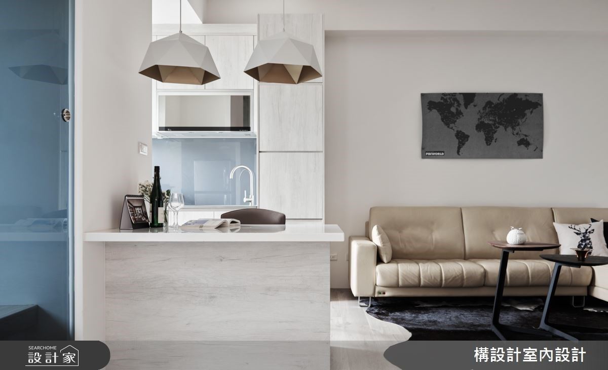 >> 绝招:中岛 = 餐桌 = 吧台,打造三合一多功能台面 当 15 坪住宅有了 3 房,餐厨空间真的就必须牺牲了吗?构设计为了解决屋主希望未来有健康料理生活的梦想蓝图,在厨房後方增设一个 all in one 多功能台面,下厨时能当中岛料理台使用、用餐时便是餐桌机能,平时则是能惬意入座、品茗小酌等享受悠闲生活的高脚座位区。此外,台面下方更隐藏着柜体机能,运用小巧思补足家庭收纳问题。屋主入住後,也表示自己愈来愈喜欢下厨煮饭了呢! **美型餐厨关键字: #自己煮才健康 #中岛就是餐桌 #餐桌就是吧台
