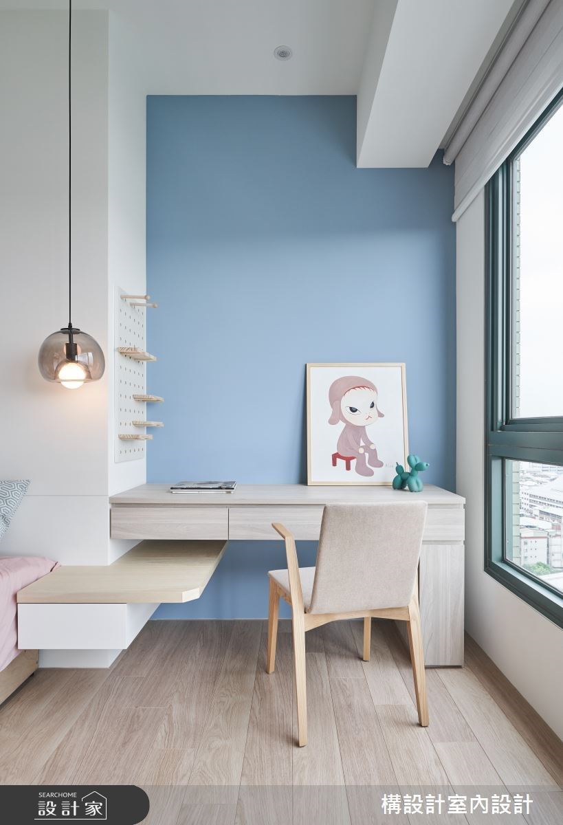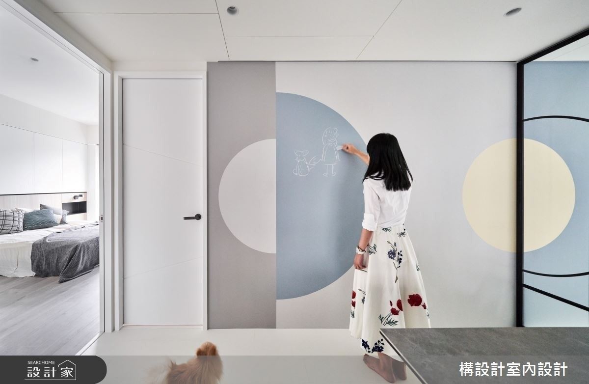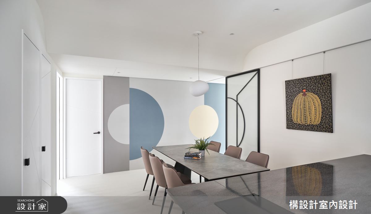 >> 重点巧思:进口无毒黑板漆,让家长安心无虞! 几何墙面不啻增加空间表情,更能创造住宅空间的视觉焦点。在此案之中,构设计以圆形、半圆及长方幻化为餐厅墙面元素,在蓝、灰、深、浅之间,创造轻盈跳跃的粉嫩优雅底蕴。除此之外,为了给学龄前孩童一个健康无虞的居家环境,设计师特意挑选不添加有机溶剂的丹麦进口无毒涂料,让家长和小朋友皆能安心在墙面上尽情挥洒创意;而黑板墙不只是心情涂鸦,更可以成为夫妻俩的生活备忘录 To-do list,将待办事项或提醒写在黑板墙上,让墙面成为凝聚家人温馨的记忆热点。