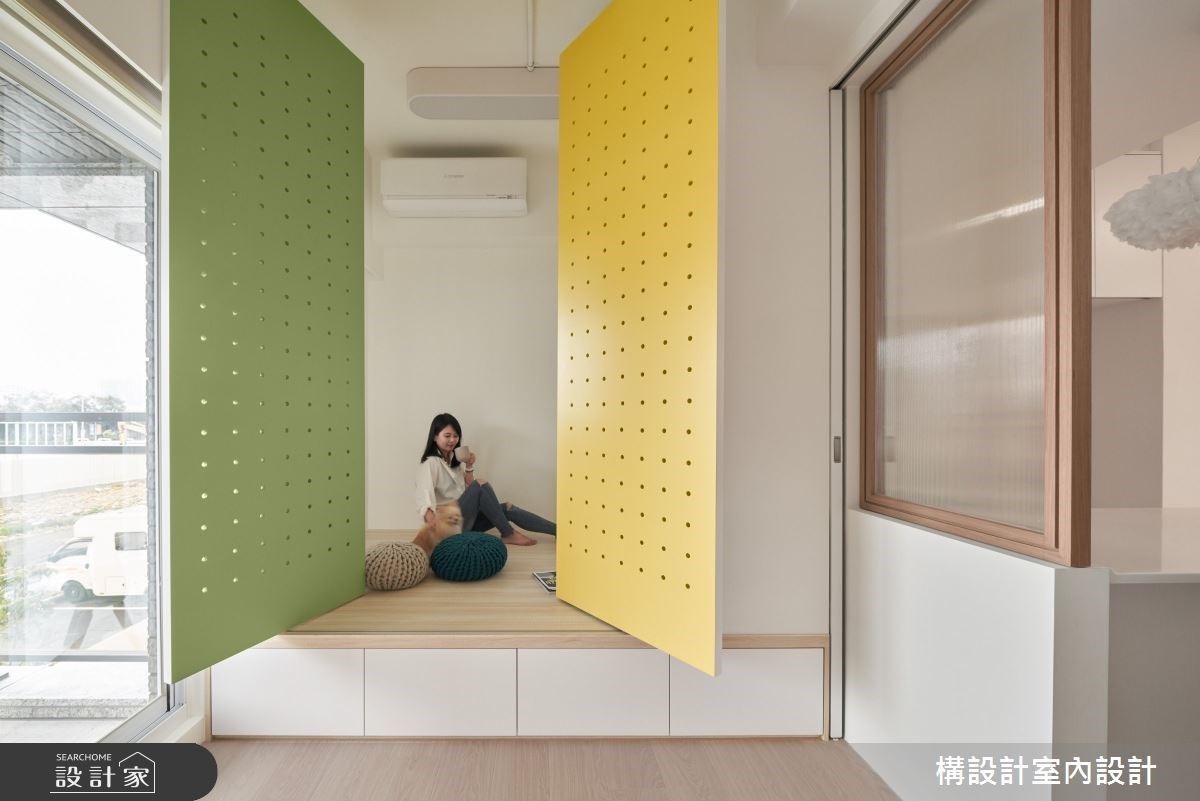 >> 重点巧思:展示屋主品味,吊挂衣服、家饰品都OK! 如果洞洞板同时也是旋转门,可以激荡出如何的空间乐趣?由於仅有 12 坪,在坪数有限的情况之下,墙面设计重点便在於其内的复合型机能。因此构设计将儿童房房门打造成「洞洞板」,更结合旋转门机能,除了可以随心所致翻转至鹅黄嫩绿或优雅纯白,也可插入木杆,吊挂外套、牛仔裤等衣物,作为隔日还能续穿的「一日衣柜」;二方面还能摆放植栽、收藏物、家饰品,呈现屋主品味个性的延伸,让居家有着独一无二的记忆轨迹。