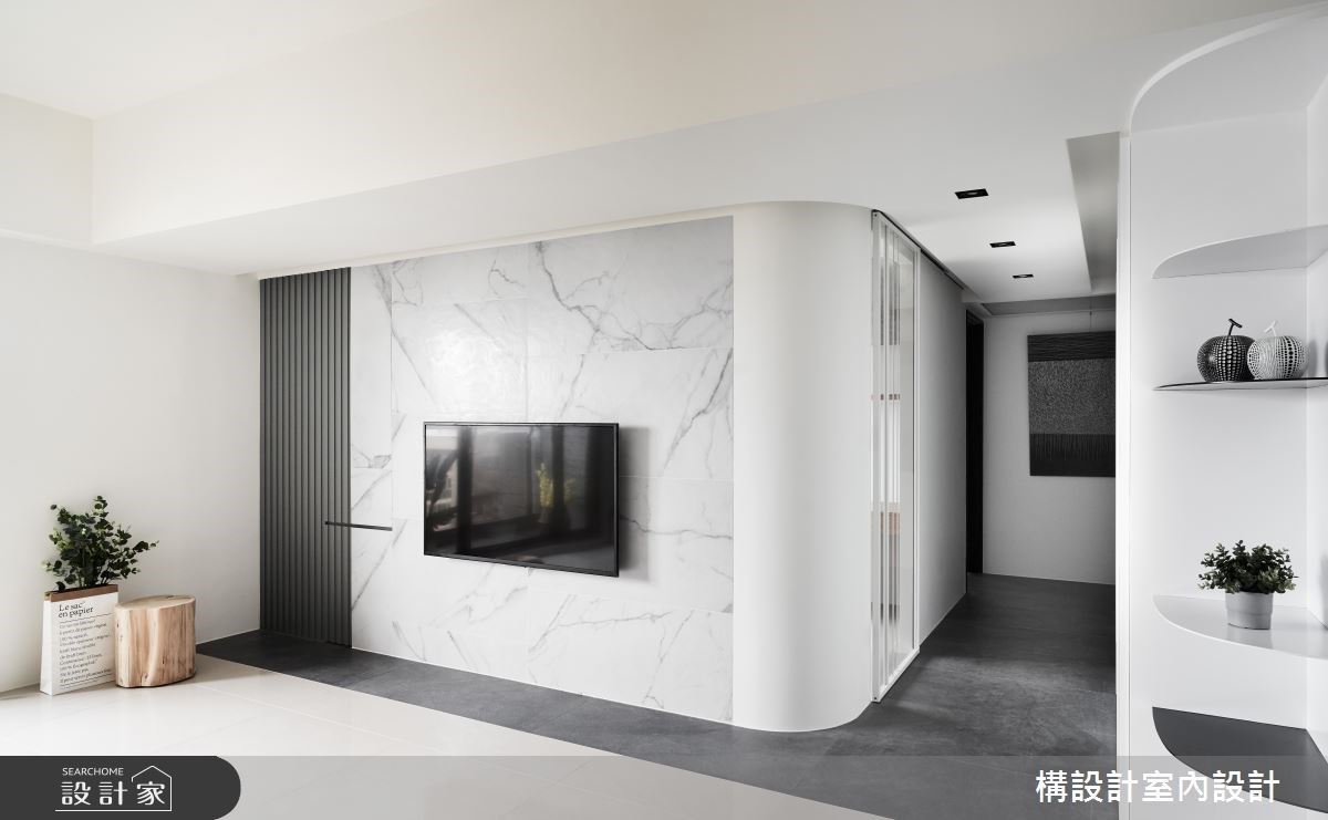 >> 重点巧思:线条切割、特殊涂料、莫兰迪色系 杨子莹认为,住宅之於屋主,是二三十年以上的长期陪伴,在空间动线、格局配置与机能需求之外,空间风格与立面视觉若能保持简约调性,便不会有「退流行」的隐性风险。因此,墙面肩负风格底蕴的承载,除了涂刷白漆,更有其他方式呈现简约都会质感,像是不对花的白底灰纹大理石电视墙面,更显自然写实,搭配全白弧形设计的电器柜体,充分利用转角空间做隐藏式收纳。