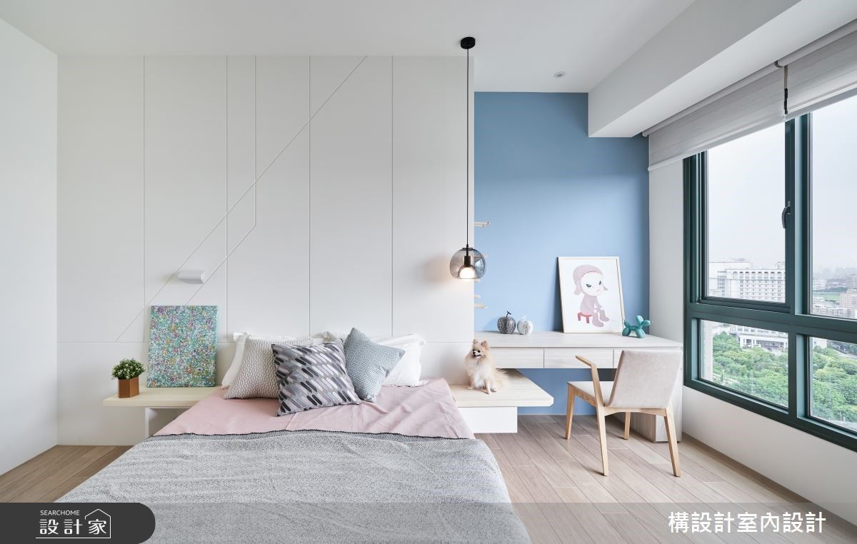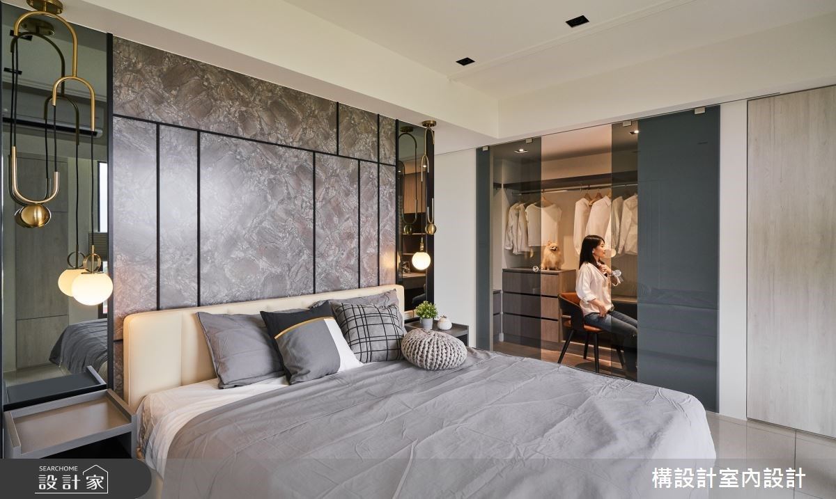 针对卧房空间的墙面设计,仿石纹及沉稳深色的美耐板床头墙面,与床头铜件灯具相辅相成,叠合出雅致都会意境,也诠释雍容典雅的时尚氛围。此外,另一案卧房的斜向直线也隐含设计缪思,不但藉此增添素白床头墙面的造型细节,一旁再搭佐莫兰迪色系的粉嫩湛蓝壁面,转角处更配置小型洞洞板作为饰品、收藏的展示之用,汇集复合型态的细腻巧思让空间展现独特的视觉丰采。