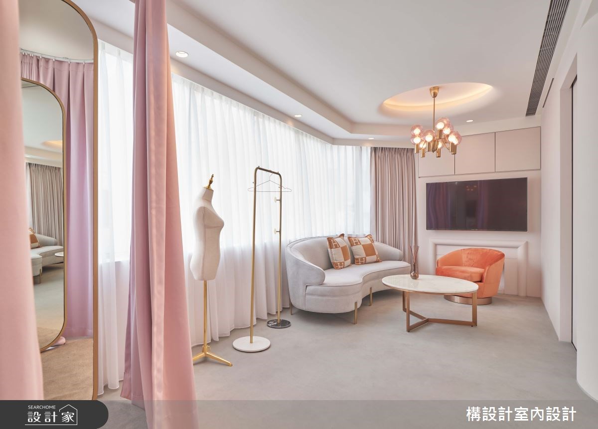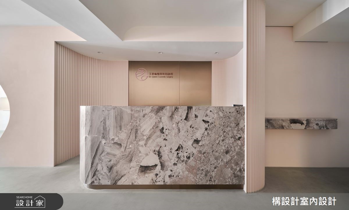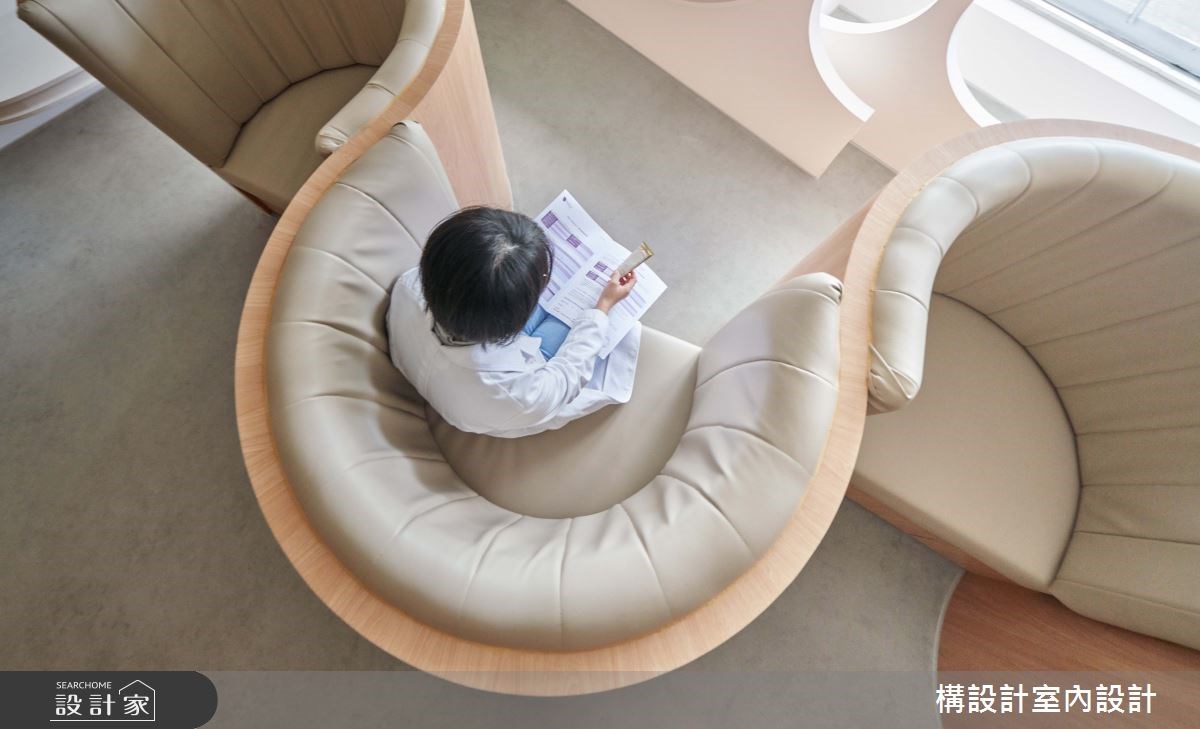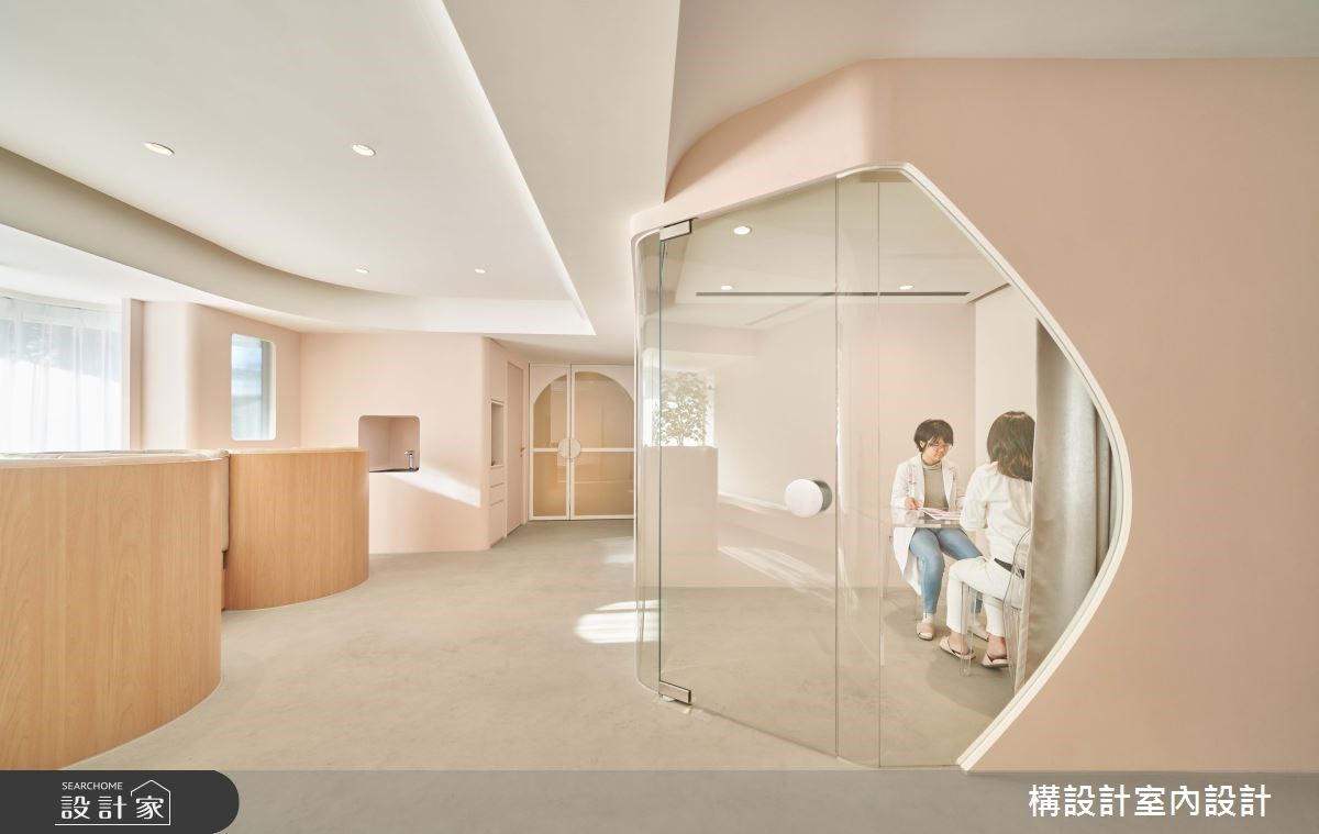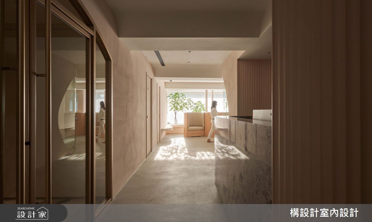 为了喜爱日式侘寂风的业主,构设计的杨子莹设计师运用雾面的特殊涂料地板,以及灰粉色的圆弧造型墙面,打造温婉柔和的自然氛围。考量日光与隐私的平衡,候诊区特别将座椅向室内退缩,落地窗边的位置则规划为布置植栽的造景花台,当作空间与心理的疗癒缓冲地带。而等候座位选择 S 型的曲线造型,贴心减少面对面的尴尬,柔软的椅面也轻托起渴求美丽的灵魂,让人感到无比的安心。