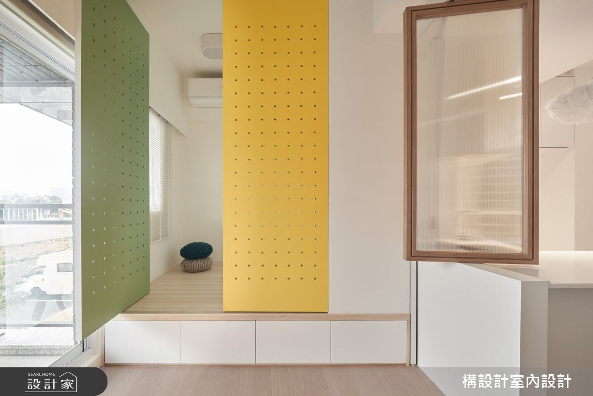 推开厨房旁的拉门,书房和儿童房选择高弹性的黄绿色旋转门,划分出不同的机能区域,清新的色彩给人活力充沛的视觉印象,而旋转门上的洞洞板设计,能够随兴吊挂植栽、摆饰或收藏品,成就专属的生活美学。主卧藉由弧形床头板将疲惫的身躯紧紧拥抱,两侧则配置顶天立地的衣柜,以及 L 型的书桌兼化妆桌,把所有杂物都收整乾净,仅留下木白色系的优雅气质,创造舒适无负担的睡眠环境。