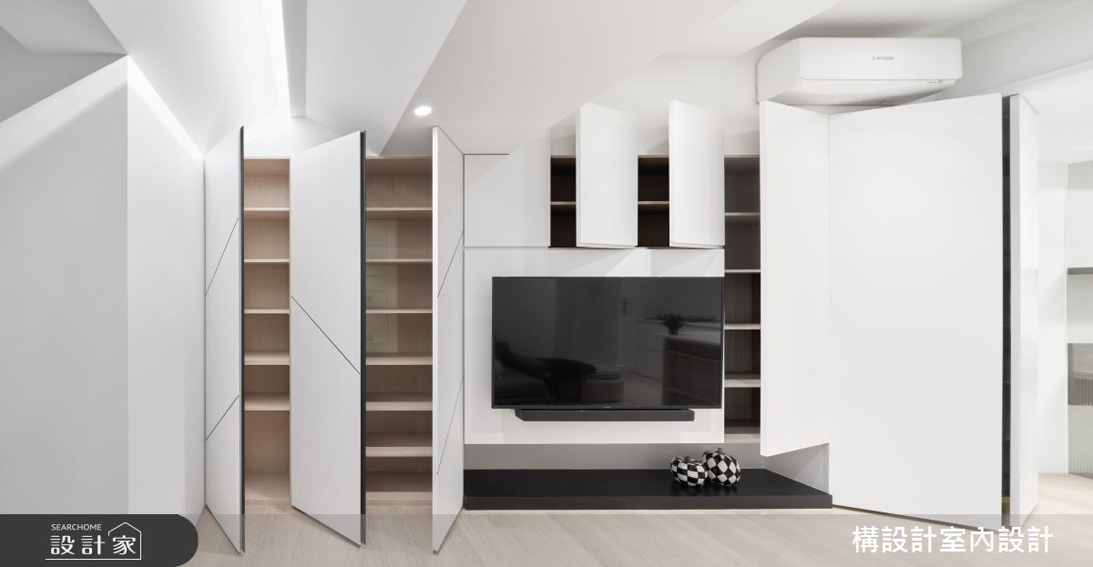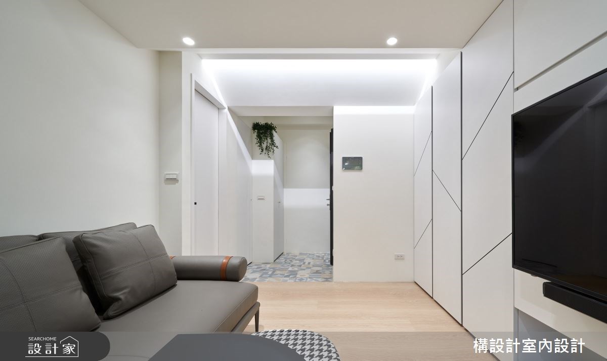 位於几何花砖玄关和纯白客厅之间,原本尴尬的大梁在杨子莹设计师的巧手之下,运用斜面的天花设计修饰弱点,并搭配柔和的间接照明,大幅降低梁柱存在的压迫感,灯光则宛如阳光轻轻洒落,照亮室内空间。客厅电视墙将繁复的收纳柜,整合为一片机能墙,且藉由圆弧的墙面造型和树枝状的门片线条,取代制式呆板的柜体视觉,使人回到家窝进高脚沙发,即能体验充满趣味的视听飨宴。