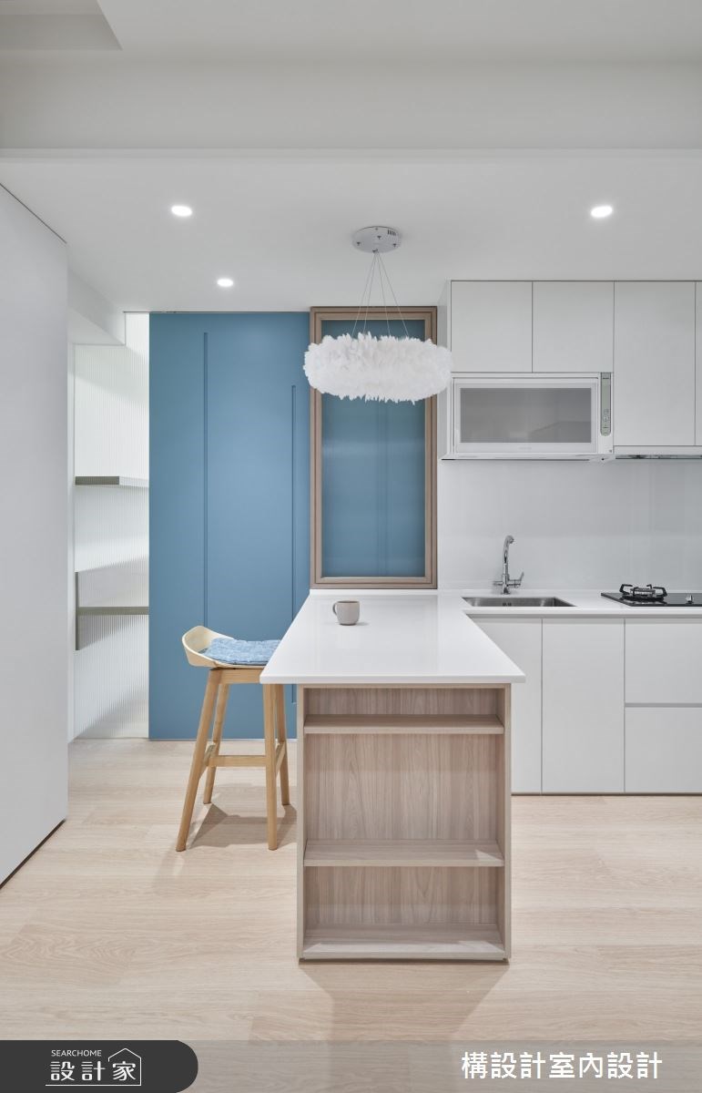 餐厨空间是小坪数住宅的重点,下班回家想要烹饪来慰劳自己,若是面对封闭狭窄的厨房,心情自然会变得更加沉重,因此善於聆听屋主需求的杨子莹设计师,采取开放式的厨房设计,结合尺寸恰当的中岛吧台,使人可以一边享受佳肴,一边跟家人互动谈心。吧台上方的云朵造型灯饰,搭配天蓝色的轻盈拉门,营造出苍穹般的辽阔意象,一进家门就可看见如此端景,由衷感到心旷神怡。