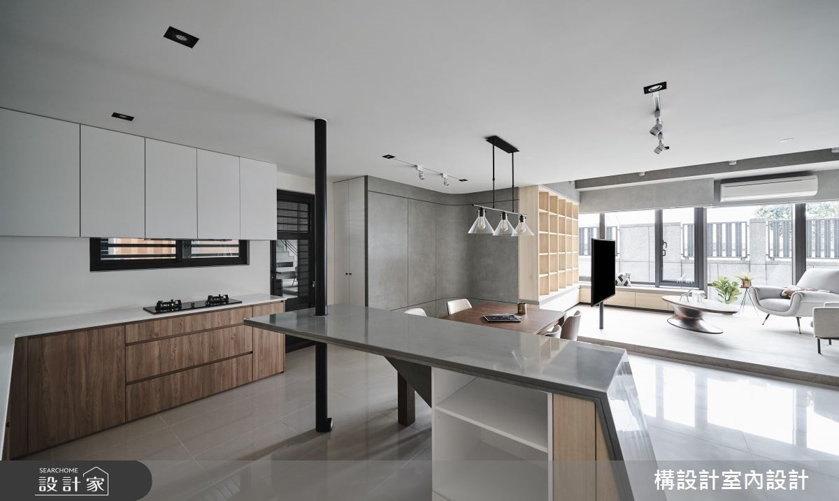 从事科技业的夫妻俩,带着两个小孩,住进这间 50 坪的现代风住宅,由於先前在美国生活的关系,所以习惯一次采购大量生活用品,拥有超强收纳的大厨房,就变成空间规划的重点之一。设计师透过安全结构立柱,定义了中岛收纳柜的造型,而电器柜采取上掀式搭配抽盘式的设计,让不同高度的家电都很好使用。餐厅墙面除了隐藏主卧室入口外,也巧妙利用墙面厚度,融入储物柜。