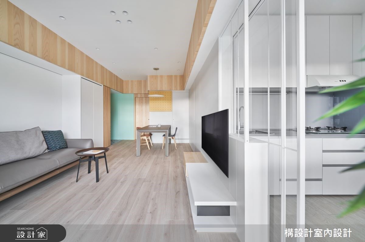 在室内空间窄长的情况下,20 坪中古屋以北欧风的姿态,整个脱胎换骨,加上厨房又是属於一字型厨房,因此设计师重新思考格局规划,将电器柜移至客厅沙发旁,并藉由电器柜的 60x60 公分上掀式抽盘,来摆放炊饭锅、家电,解决厨房空间不足的问题。餐厅一侧还多隔出了储藏室,且利用 35 公分的墙面深度,提供屋主想要的玄关柜,藉由复合式的格局设计,使空间功能变强大。