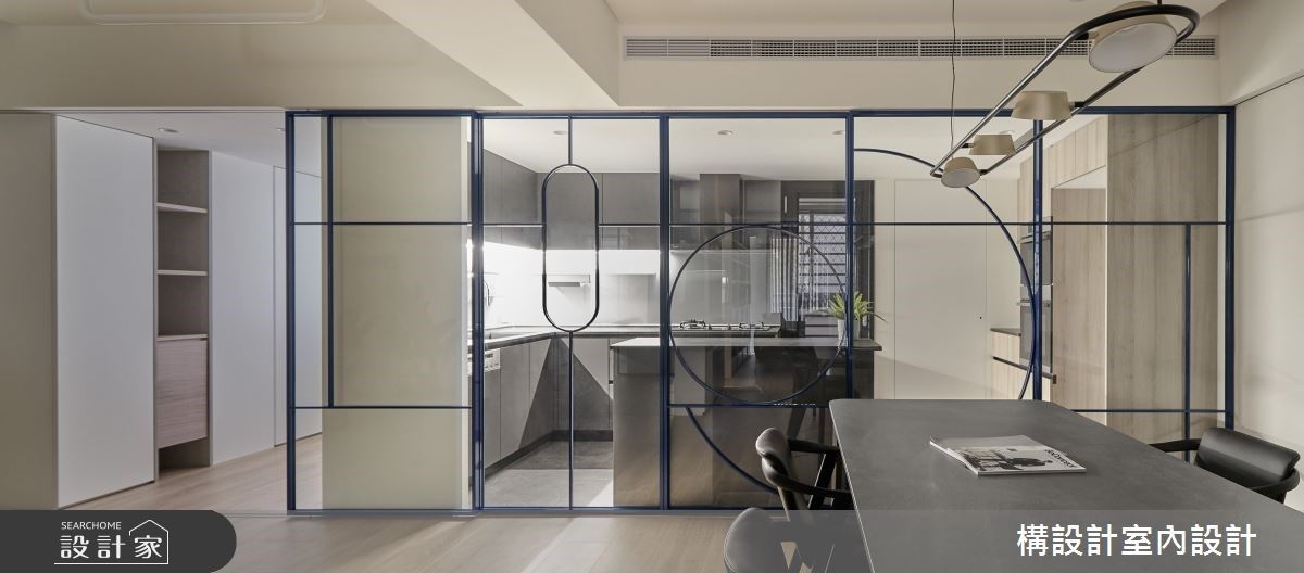 50 坪的北欧风老屋,住着夫妻俩与双胞胎,男主人喜欢煮饭,希望拥有中岛又不想要油烟四散,因此厨房采用几何造型门,门关起时,吧台椅可以往内推,形成完整的中岛厨房。玻璃拉门的深蓝色线条,呼应客厅收纳柜的色彩,也跟男主人喜爱的深色厨具完美契合,加上屋主一家喜爱几何的关系,因此不仅从玄关到浴室都充满几何元素,通透的拉门也勾勒趣味图腾。