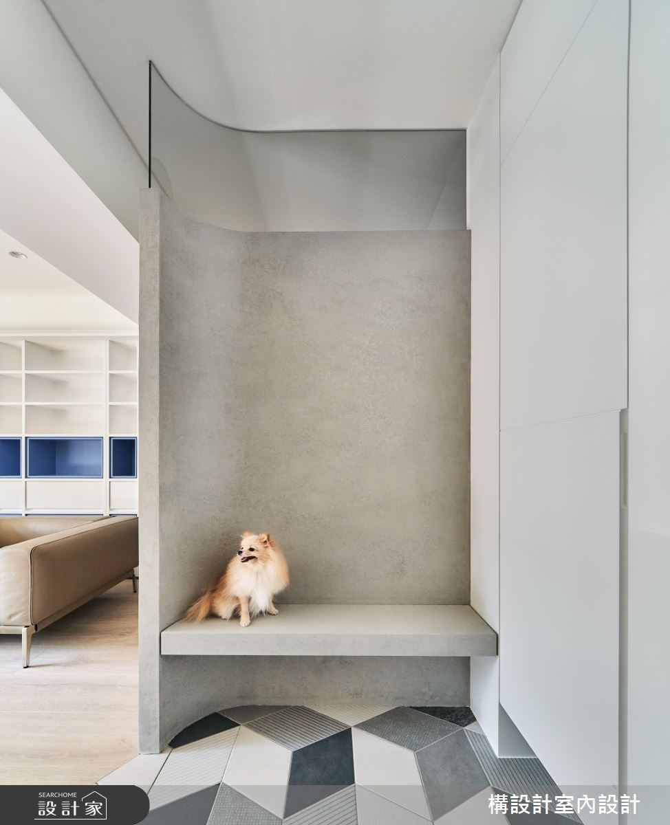 改造前老屋与邻居为对门关系,缺乏隐私,在改造後利用仿清水模墙面塑造独立玄关,墙面上方选用通透的玻璃材质拼接,增加长型公领域通透感。
