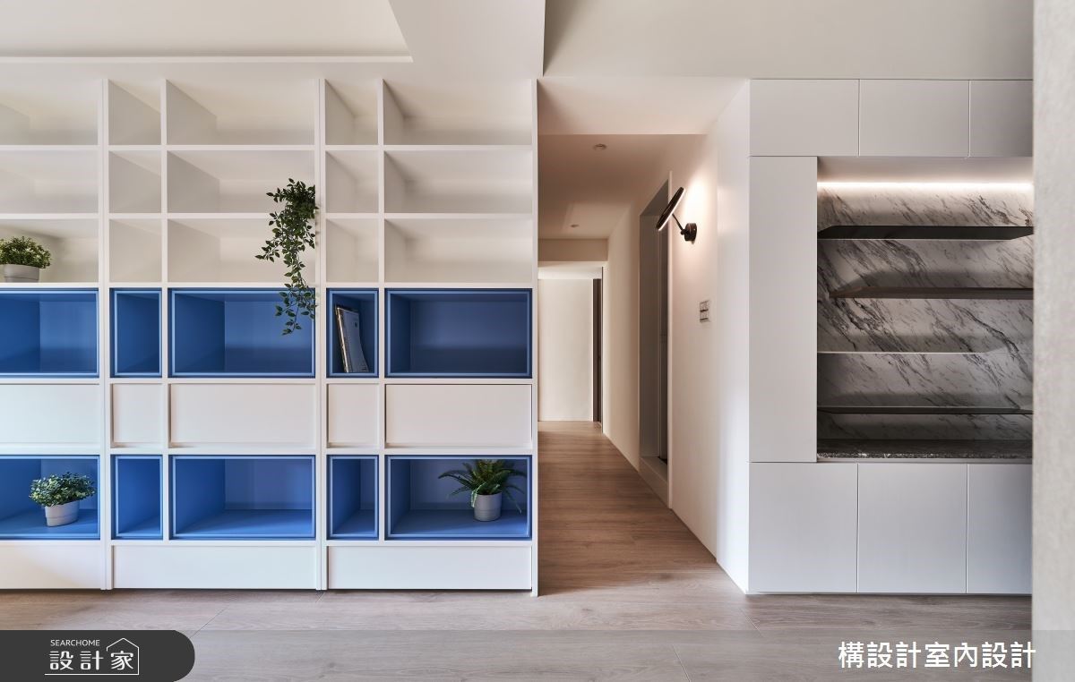 屋主夫妻希望为女儿们打造一个美好的生活空间,但又希望能保有自己喜欢的风格,因此设计师在空间中做出不同意象的拼接,客厅沙发背墙,选用蓝色与白色拼接,营造童趣的书架,间隔一条廊道的墙面则使用大理石纹与深色层板,营造沉稳时尚的多功能展示架,在一个空间中将父女的喜好结合。