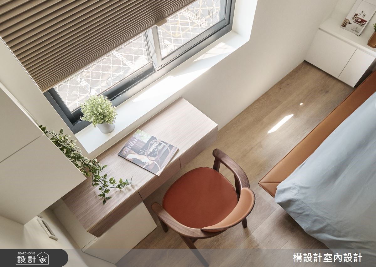 原本的主卧空间光线阴暗,收纳空间不足,为了增加独立更衣间,选择改变床的位置,浅色系搭配放大空间感,将桌面置於窗边营造明亮舒适的多功能空间。