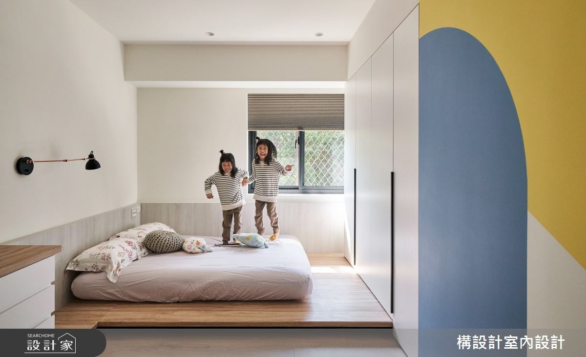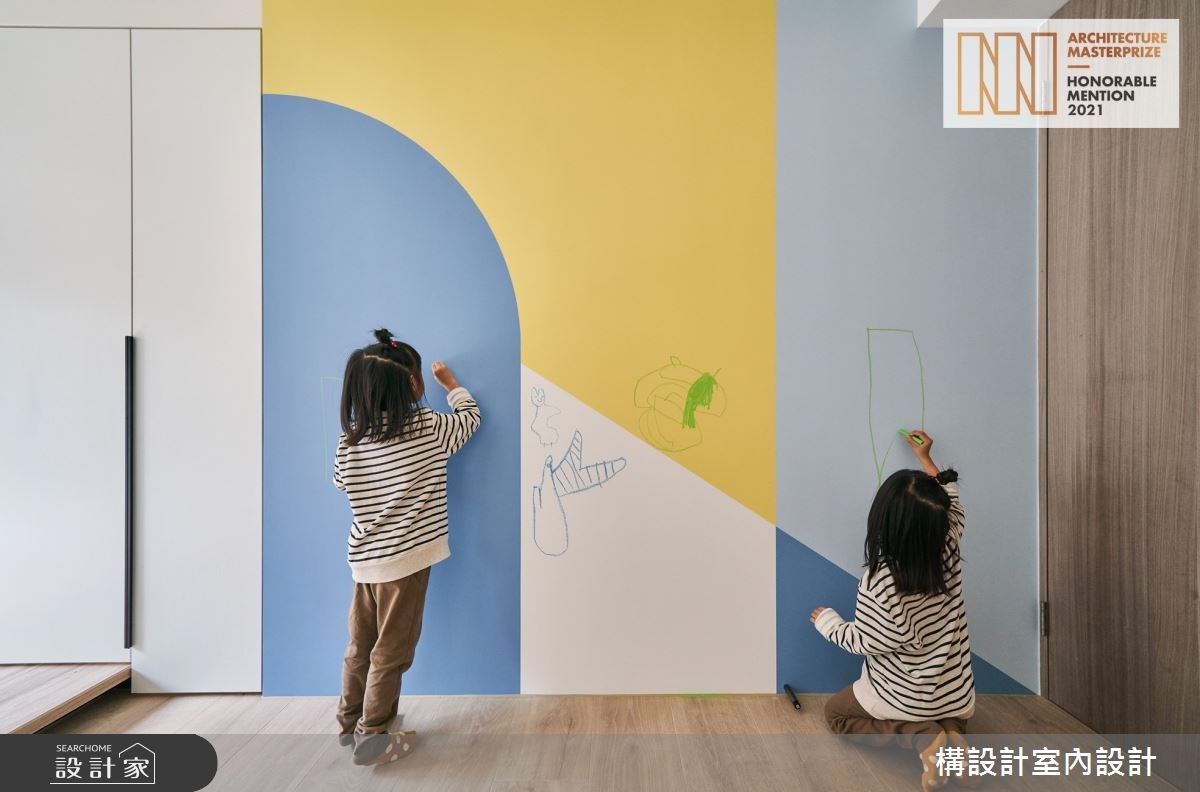 屋主的双胞胎女儿们正处在对所有事物都感到好奇的年纪,为了让两位女孩能尽情的展现创意,设计师选择在女儿房中加入黑板漆,黄与蓝相映,带出女儿房整体风格,充满童趣,因为孩子年纪尚小,目前共用一间卧房,考虑到未来的成长,希望卧室能有更大的弹性,因此选用卧铺设计,将地板抬高,加强领域性,其中一间女儿房可作为游戏室或客房使用,在未来则可作为另一间女儿房。