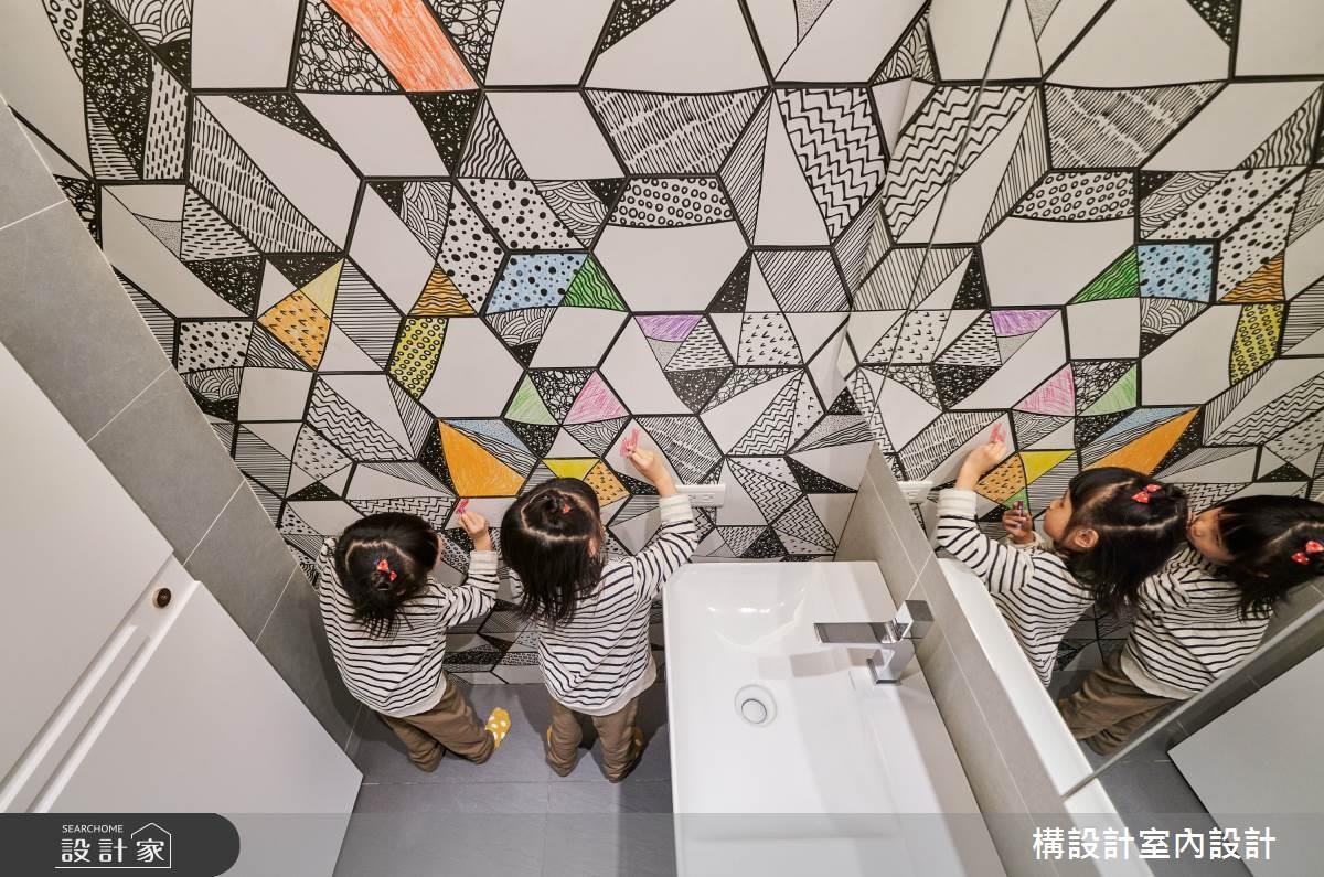 客浴主要为两位女儿使用,因此放置两个洗脸台,在赶着上学的未来,也可以同时使用,不必排队等待,浴室内部几何磁砖为可绘画磁砖,增添浴室趣味性。