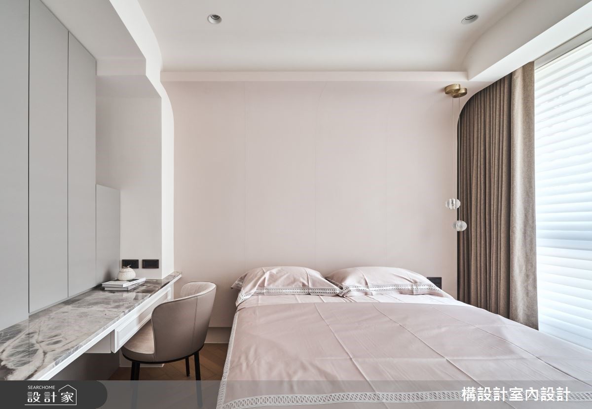 此案虽为新成屋,但大门正对厕所有风水疑虑,因此将卫浴空间移入卧房并增加浴缸,使沐浴空间更加宽敞疗癒,浴室拉门选用优美的进口壁纸,营造如画框般质感。舒眠空间以公主床为原型,床头墙弧形设计弱化梁柱,粉色调搭配灯光增添浪漫氛围。柔和浪漫的丝柔百叶柔化空间,虽然视觉优美,但却有遮光率不高的问题,因此选择在丝柔百叶後方加入粉调布帘,提升睡眠品质。床边桌面整合收纳与梳妆机能,双面设计将空间充分利用,内侧柜体选用半高设计,将光线引入内侧客厅,增强采光与通透感。