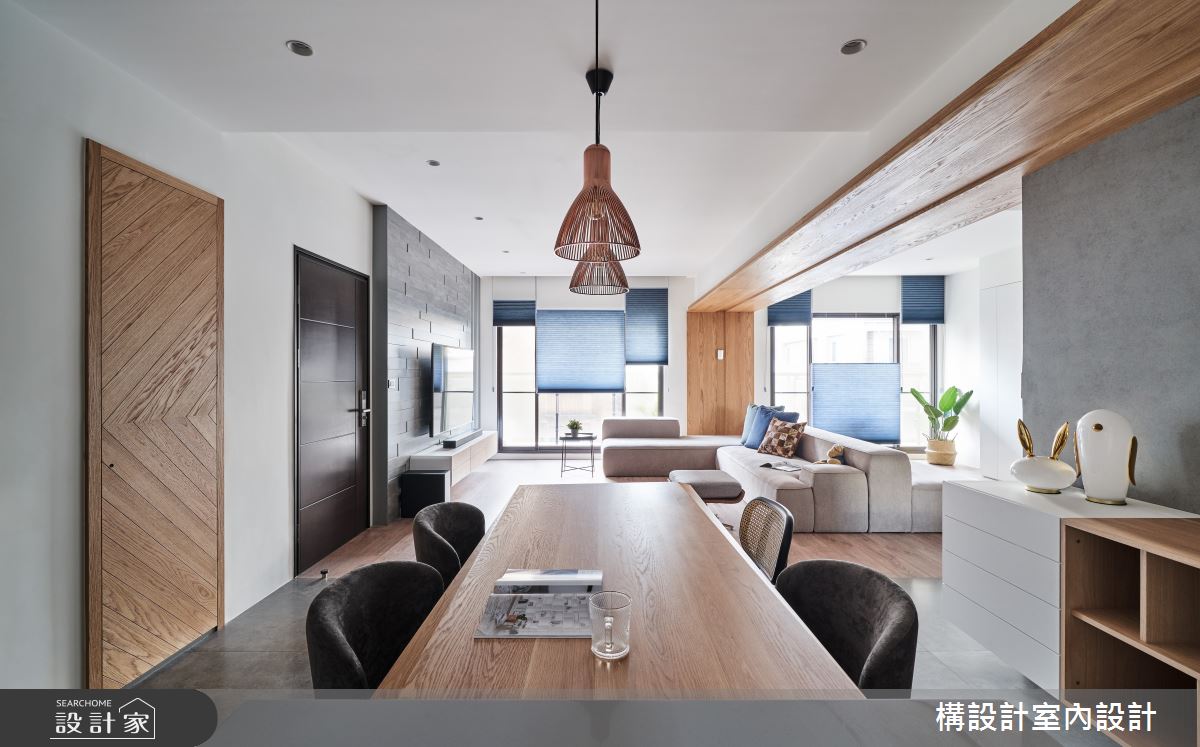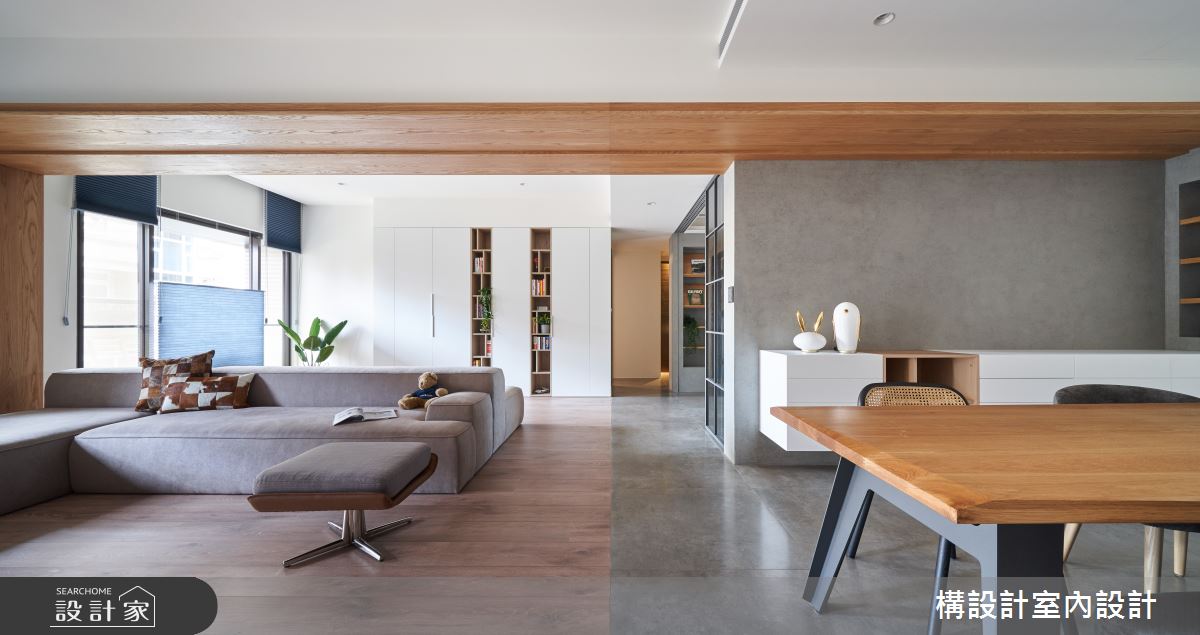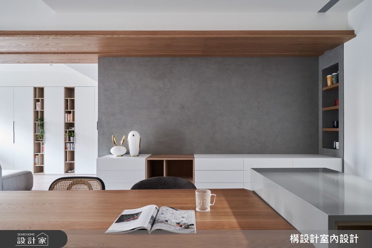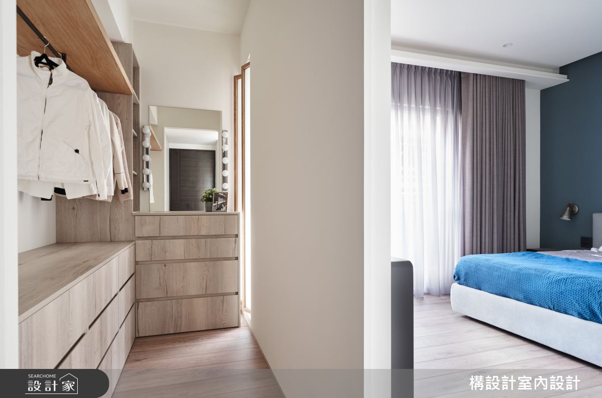设计师将公共厅区范围延伸拓大,获得了视觉上的宽阔感,并融入天花板独特造型,透过木质调的延伸,自然地降低梁柱压迫感,且无形串联不同的居家领域,客厅则运用双面沙发的摆设、打破传统客厅风貌,一端面向电视墙,另一端则朝向收纳柜,串起不同的空间视角,促成更美好的对话互动,同时也藉由地坪材质划分空间属性,让公领域之界清楚分明,并注入简约清爽的用色,加以绿植的轻巧妆点,衬出纾压的气息; 而视觉可见的收纳柜体,则尽可能透过色彩、材质、位等搭配,呈现量体轻盈度,以穿透并不阻碍视觉开阔性的形式存在於生活中! 小编的最爱 书房,则以玻璃为门片,打造穿透性之余也兼顾界定效果;而寝室内则赋予流畅的动线,连贯卧眠区与更衣间之间的关系,形成更便利的使用情境!