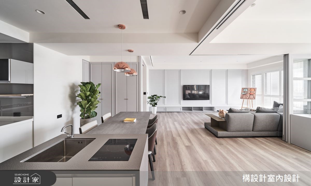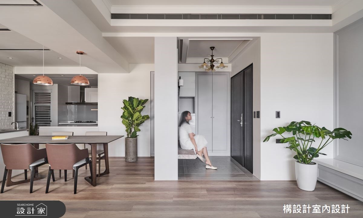 「打造一个能让心境慢下来的空间,细细品味生活中的每个时刻。」是构设计替退休屋主打造的理想居宅。165平米新成屋以美式风经典的线板、砖墙和木地板来建构优雅舒适的空间风格,顺着梁柱结构用玻璃拉门作为公共区域隔间,让客厅、书房与厨房中岛彼此共享又能各自独立,创造更灵活的开放式设计。 进门後餐厨区域的墙面让玄关形成方正格局,嵌入式收纳鞋柜维持空间的平整,好规划舒适穿鞋椅让进出门时可以从容地穿脱鞋子;落尘区的磁砖换成超耐磨木地板替场域做了鲜明的定位。客厅、书房与餐厨空间三方关系,利用大梁的位置划分客厅与书房空间,以玻璃拉门作为书房轻隔间,闭合时书房隐私性提升却依然保有采光与视线通透感;收起後公共区域空间感大增。书房的收纳也可以与客厅混用,窗边卧榻成为客厅之外的私人休憩秘境与临时客房,视线也可以直接穿透到厨房中岛,优化公共空间内各场域的关系。 主卧透过减法设计将衣柜与化妆台都收整在贴墙的高深柜体,白色烤漆降低收纳柜的厚重感,并以线板装饰门片的切割线条让量体看起来更轻盈。灰色调浴室用花砖拼贴造型墙,浴缸设计在开窗处有利通风,搭配缸上型淋浴门做出乾湿分离,打造宽敞舒适又实用的卫浴空间。 小编的最爱 在白色与木质调的空间里添加一点嫩绿与灰蓝,让美式风格更接近自然。坐卧在书房的阳光卧榻上,静静阅读偶尔看向窗外,任谁都会觉得是里想的退休生活画面。