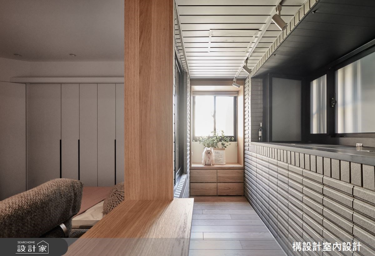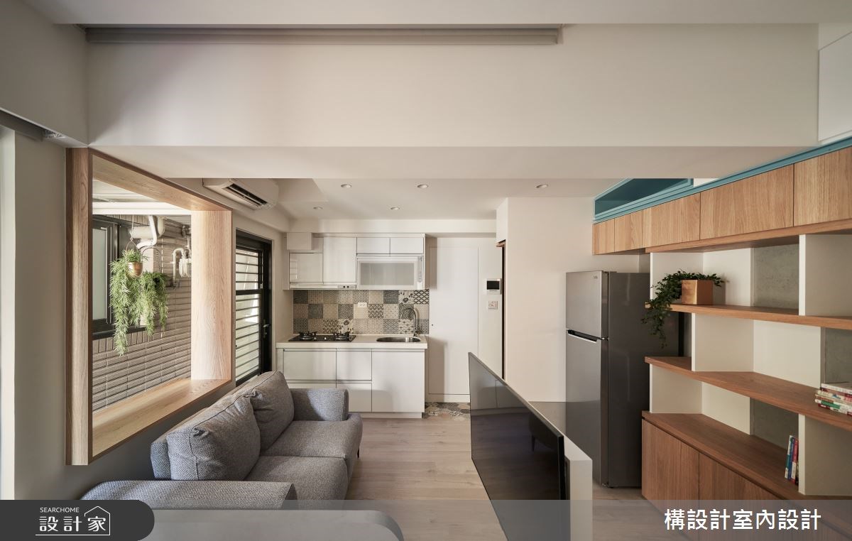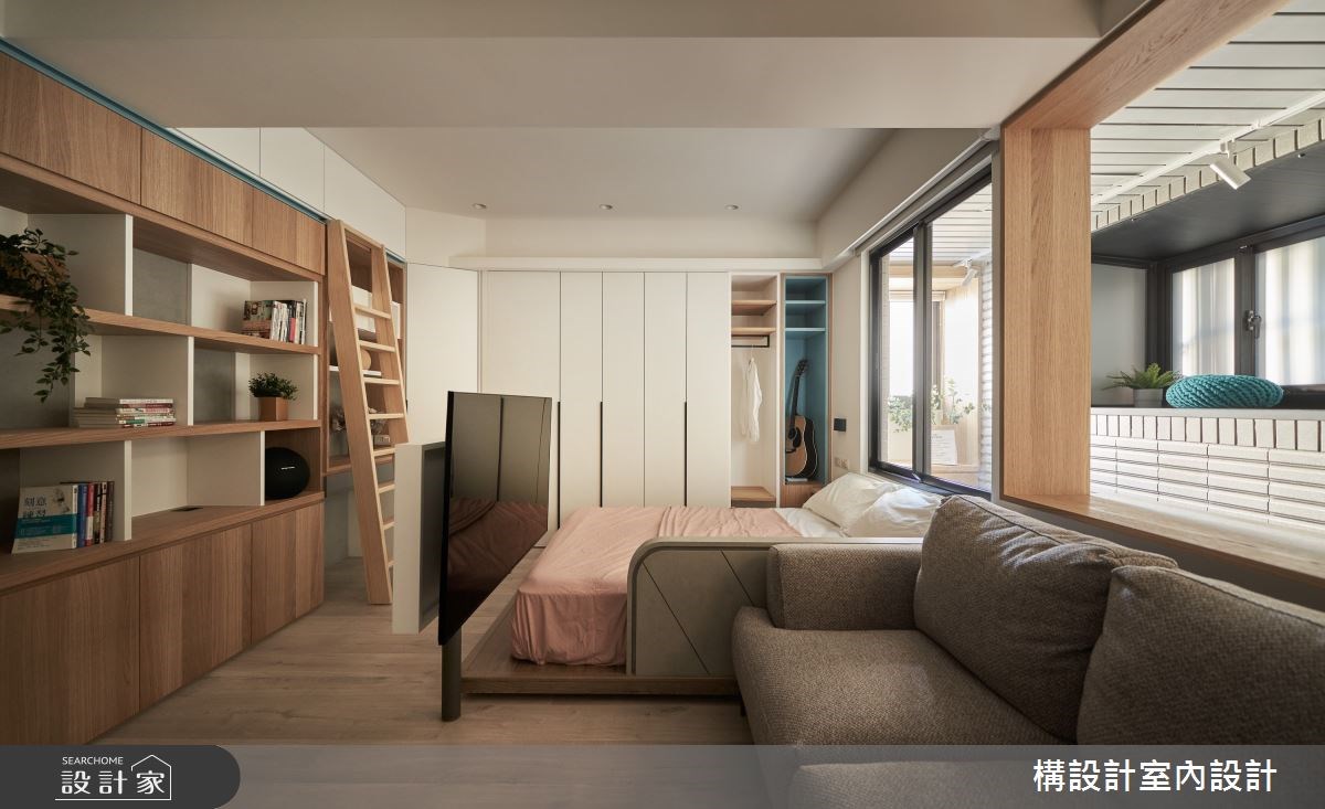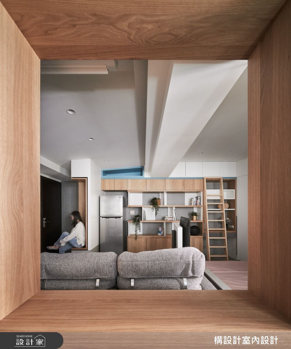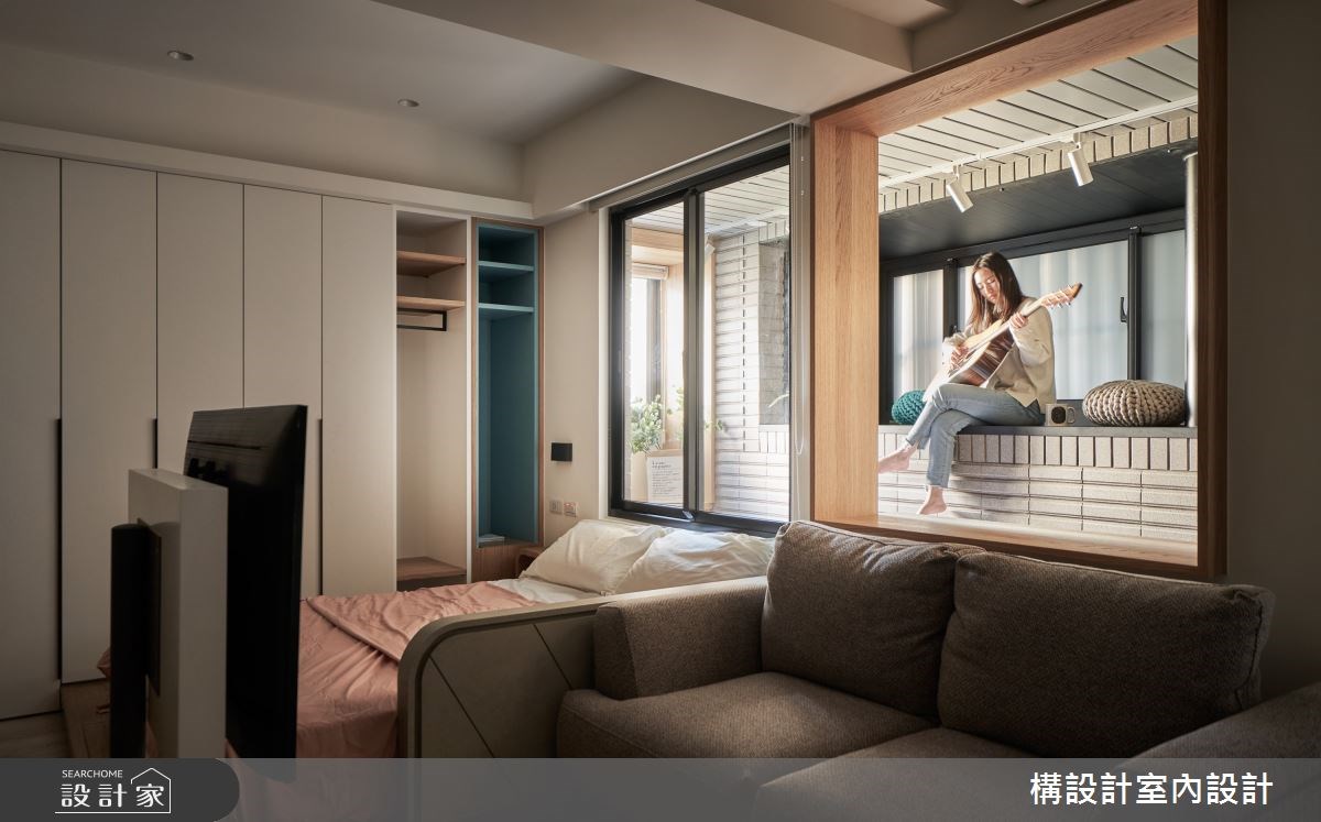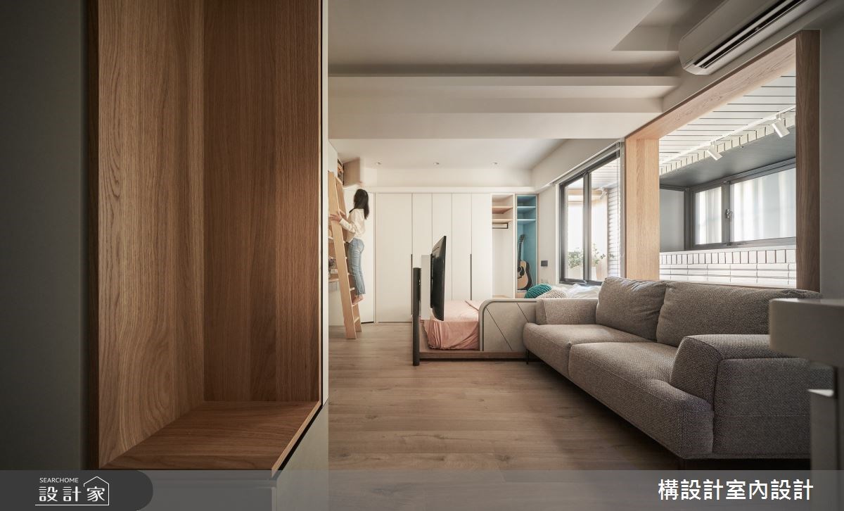 改造指南 1. 小坪数如何划分房与厅? 2. 客制化设计把小木梯加入生活里 3. 阳台空间应该怎麽规划? 设计师这样做 面对室内 9 坪+阳台 2 坪的微型住宅,构设计重新编排格局不仅轻松划分出房与厅,外加丰富收纳、料理机能还有舒适大阳台!首先打破旧有格局後用卷帘取代实墙,轻松划分客厅与寝室更增加使用弹性;可旋转的电视让观影视角更多变,卧铺式床铺更显放松,打造女医师理想的厅房设计。 玄关订制顶天收纳柜,转角结合穿鞋椅凳设计提升玄关机能。采用灰白拼接木皮、并以框景概念设计同时也修饰了入门视觉,将低结构梁的存在。落尘区六角花砖不规则的发散延伸放大空间,与木地板自然地衔接创造活泼风格。不影响结构下将原始窗框改为木头,营造更具风格的休憩空间,也透过框景设计创造视角的变化。厨房与卫浴挑选花砖作为防溅板与墙面材质,丰富了无印风格。 规划架高木地板一路延伸到窗边,并以木质框架营造舒适的窗边休憩卧榻;下方抽屉柜可以收纳也可当作阶梯。沙发背後的木质窗框可化身半户外工作平台;偶尔屋主也会爬上原始的女儿墙弹弹吉他,把阳台改造成休憩收纳兼具的双栖设计,让生活在小空间里不需要委屈也不需要过度断舍离,就能享受机能与风格兼具的理想生活。 小编的最爱 11 坪大的空间以日系无印风格创造舒压好整理的木质风格外,特别在墙面收纳以木作打造女屋主喜爱的小木梯,增添视觉变化外也方便拿取上层收纳物品。