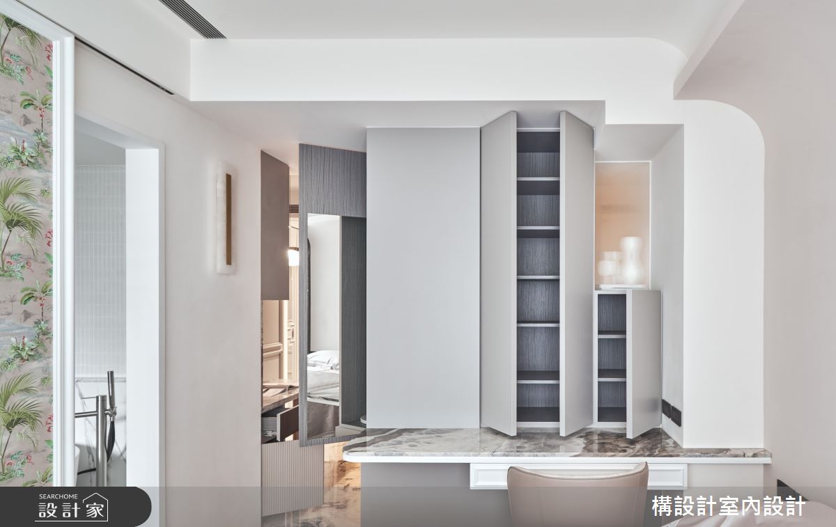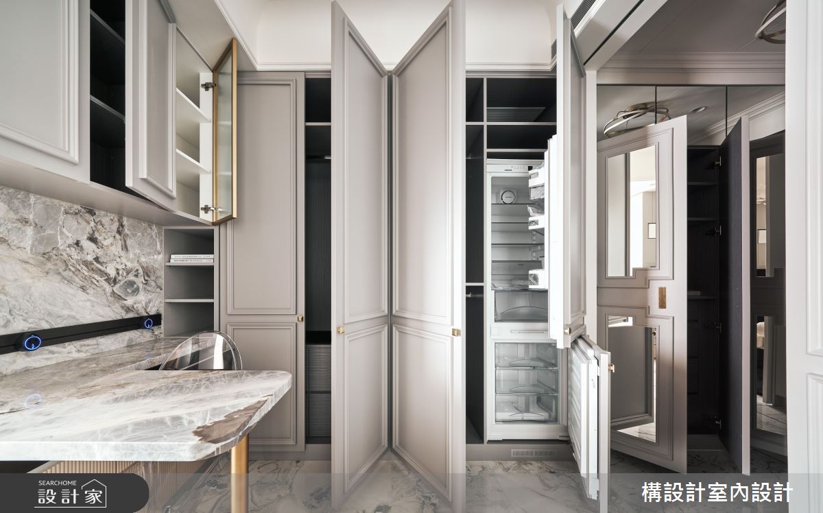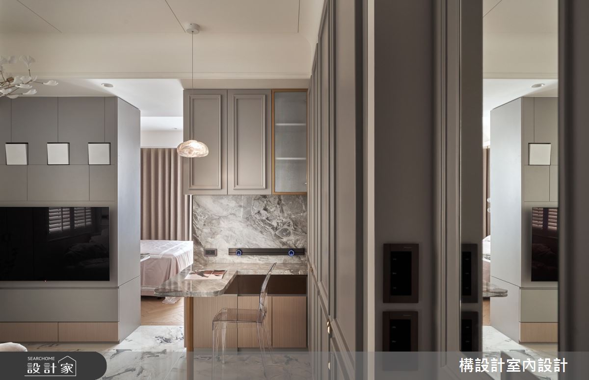 改造指南 1. 如何营造法式寓所的浪漫新古典风格 2. 完善收纳及采光的机能设计 3. 30平米小空间中可以泡澡的秘密 设计师这样做 30平米的新成屋居住成员是1位女性,喜欢有特色的法式新古典风格,希望能在有限的坪数内,保有良好的采光、充足的收纳及宽敞疗癒的卫浴空间。构设计的杨子莹设计师,善於洞悉空间特色,并结合独特的思维,为空间发展出机能与美感兼具的设计,有效扩展空间坪效、让生活更舒适。 定调整室为奶茶灰点缀乾燥玫瑰粉,在狭小的玄关与厨房区,利用明镜点缀墙面柜体,在视觉上放大空间,客厅与旁侧的多功能区域,选用简单的线板装饰墙面,结合镀钛金属点缀增加质感。另外,卧室区域选用进口壁纸,做为推拉门的造型有效提升空间质感。 为了整合收纳,多功能区的立面经拉整後均做为收纳用途,转角的畸零区域规划为开放式收纳柜,一并安排有可作为书桌、餐桌的台面。而电视墙一物多用,利用其深度规划为多面性的收纳柜,结合穿透式材质,有效让客厅和卧室的光线相互分享,达到完善收纳与采光的目的。 为实现女主人想要在家泡澡的梦想,除了在格局分配上进行调整,进入卫浴空间後,选择将浴缸放在进门处,而圆形的独立浴缸,有效减少坪效的消耗。并使用进口马赛克砖,和石纹砖以人字拼拼贴,让浴室区域也能延续法式美感。 小编最爱 为完善空间风格,不同区域点缀特色灯饰,在小空间不仅有定义使用方式的作用,也能藉此强化新古典风格。在机能方面,除了统一柜体造型,其中藏有冰箱及衣物收纳机能,而进入主卧室後规划有化妆台面,方便女主人日常生活。