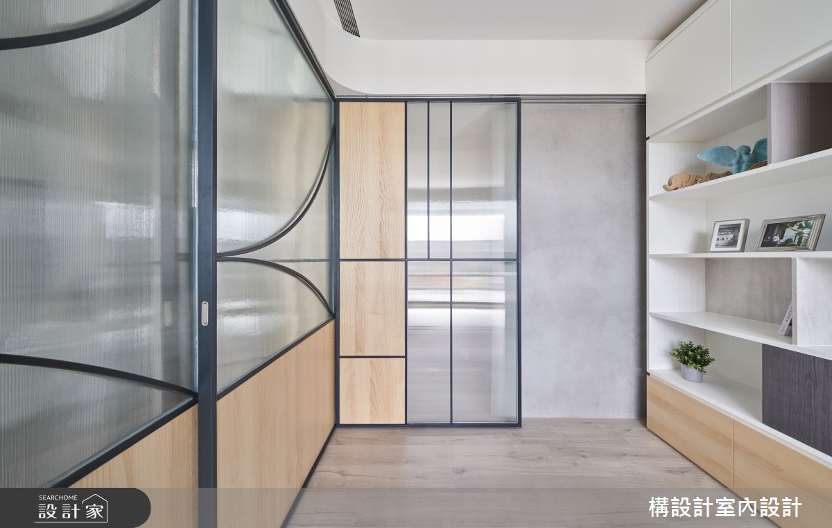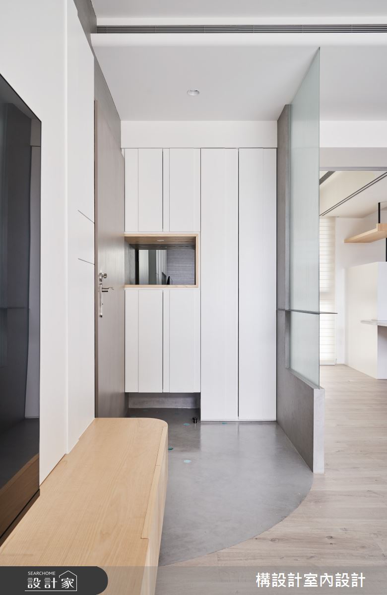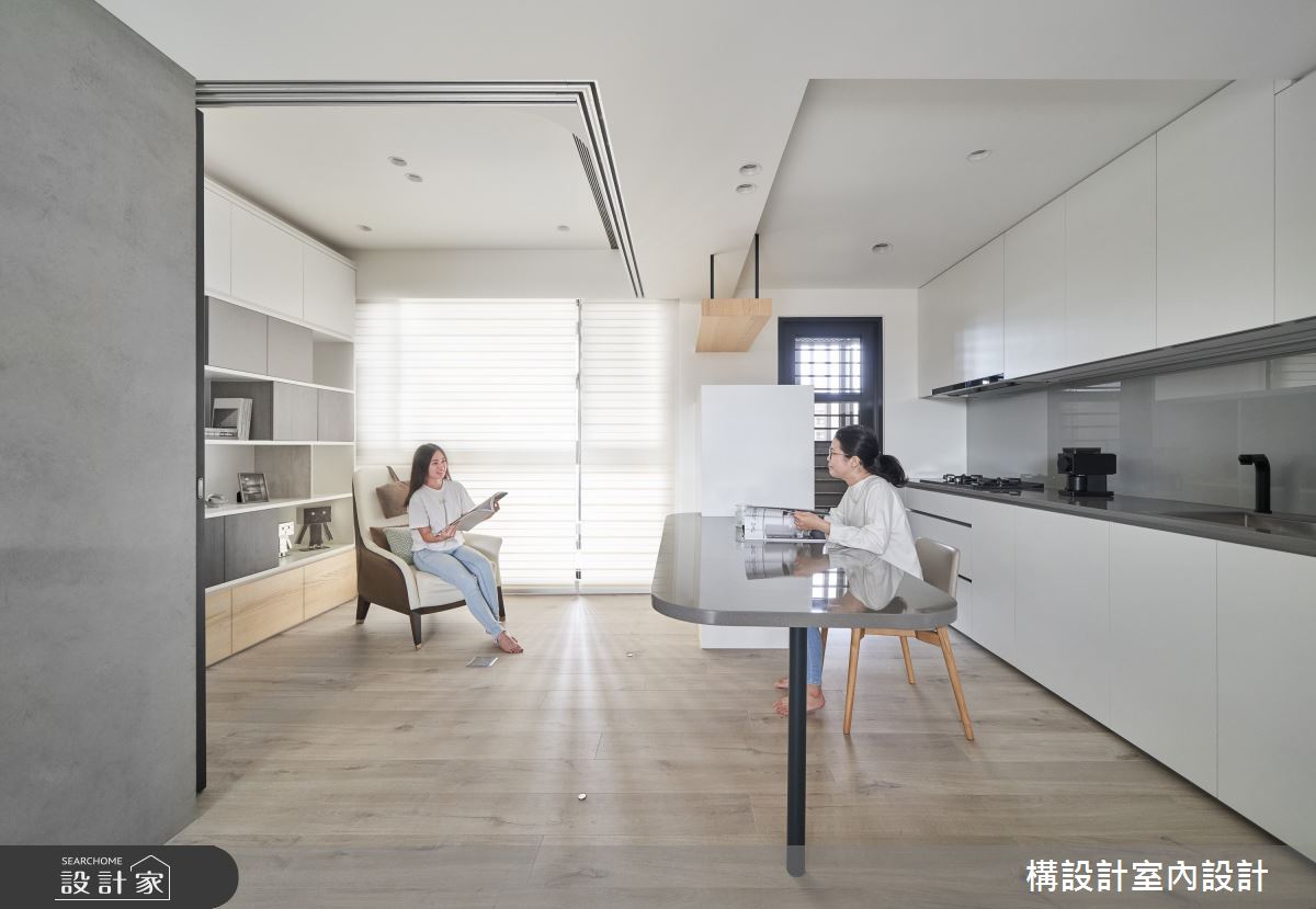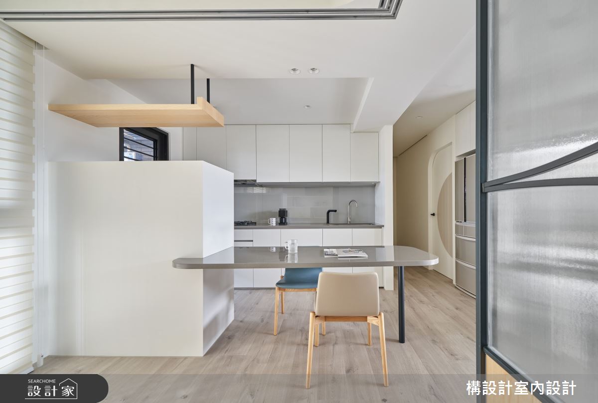 玄关地面以圆弧造型界定独立的落尘区,整合式柜体可收整鞋子及摆放随手小物,巧妙以雾面玻璃创造屏风功能,若隐若现又能化解风水疑虑。公领域以纯净白墙及水泥质感作为空间基底,搭配温润木材质平衡空间的调性,辅以日光映照,整体烘托一股静谧质朴的北欧感。开放式设计串联客厅、餐厨与书房,空间感超放大,书房特别采用造型活动拉门,打开时空间宽阔适合好友聚会,阖上时也能静静享受MeTime的时光,或当访客来时化身为客房。一字型厨房增加备餐柜,上方铁件木质吊挂架,造型美观也扩充垂直收纳机能,与餐桌结合,让料理用餐台面更宽敞。