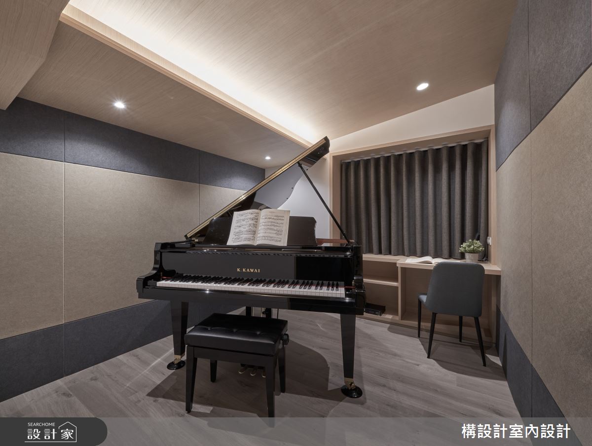 重塑公领域格局,并选用清新的灰色调与木质铺陈,玄关规划落地柜收纳与穿鞋椅,机能丰富多元,为了提供宠物游戏的空间,增设大量猫跳台,高低错落的设计弱化梁柱存在感。开放式客、餐厅放大空间感,餐桌旁佛龛设计,与整体风格融合,却又不失庄重。厨房选用一字型设计放大廊道,复古浪漫的蓝色磁砖铺设地坪,俐落优雅。私领域色调简约,光线明亮,规划大量柜体,舒适富有机能。卫浴空间选用蓝色瓷砖铺陈,分离式设计增添使用舒适度。为满足身为钢琴老师的女主人的专业需求,将琴房天、地、壁融入隔音机能,专业琴房规划,弹琴再也不担心打扰邻居。